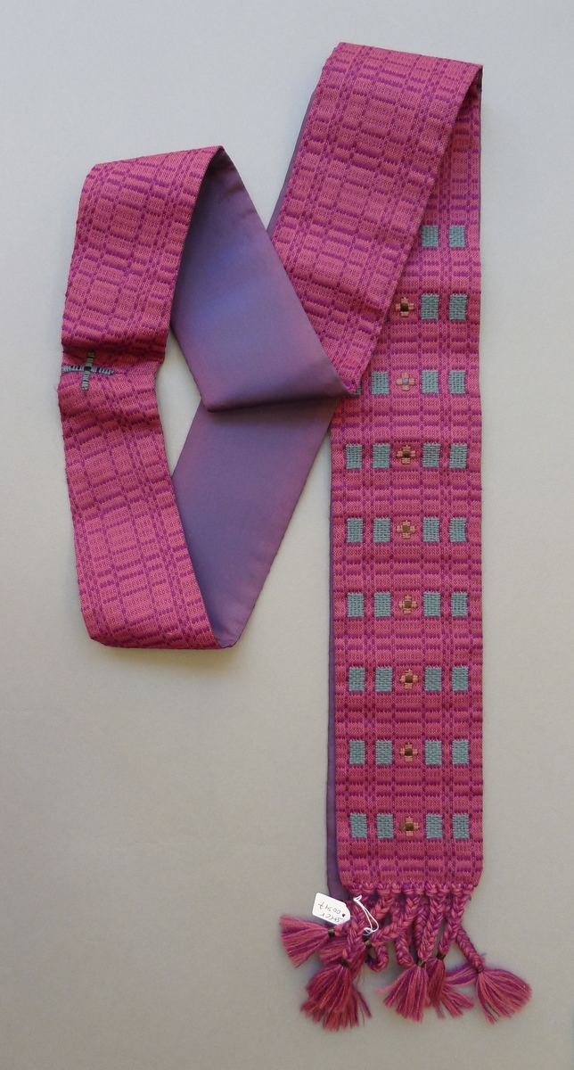Paarse bedieningsstola geborduurd met blauwe vierkantjes, geappliceerd met leren kruisjes