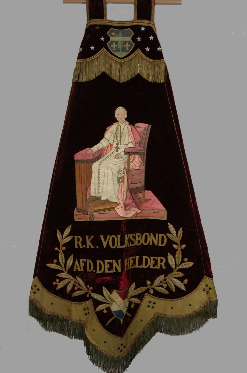 Rood vaandel van de R.K. Volksbond afd. Den Helder met Leo XIII