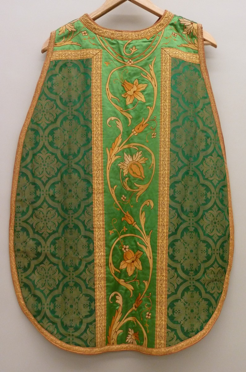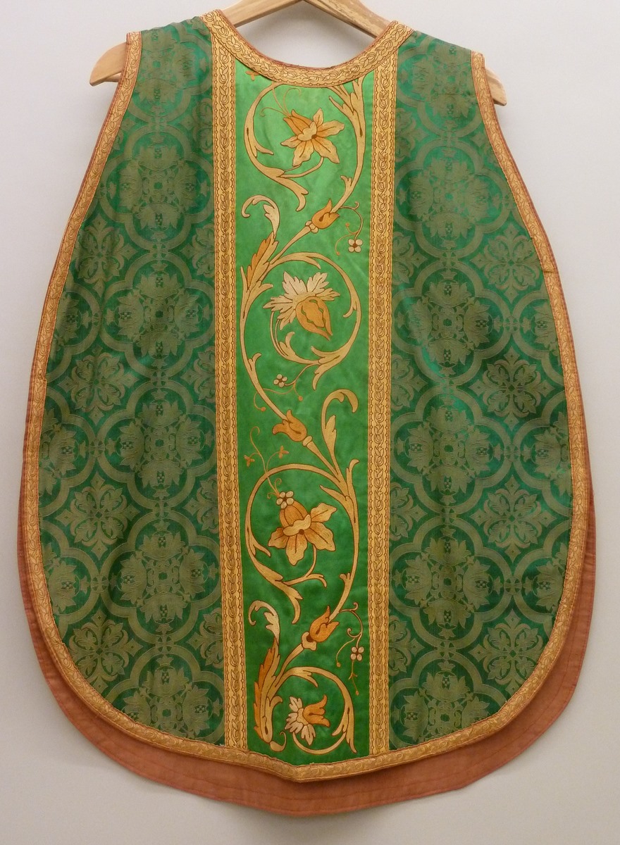 Groen kinderkazuifel met ingeweven vierpassen, geborduurd met passiebloemranken