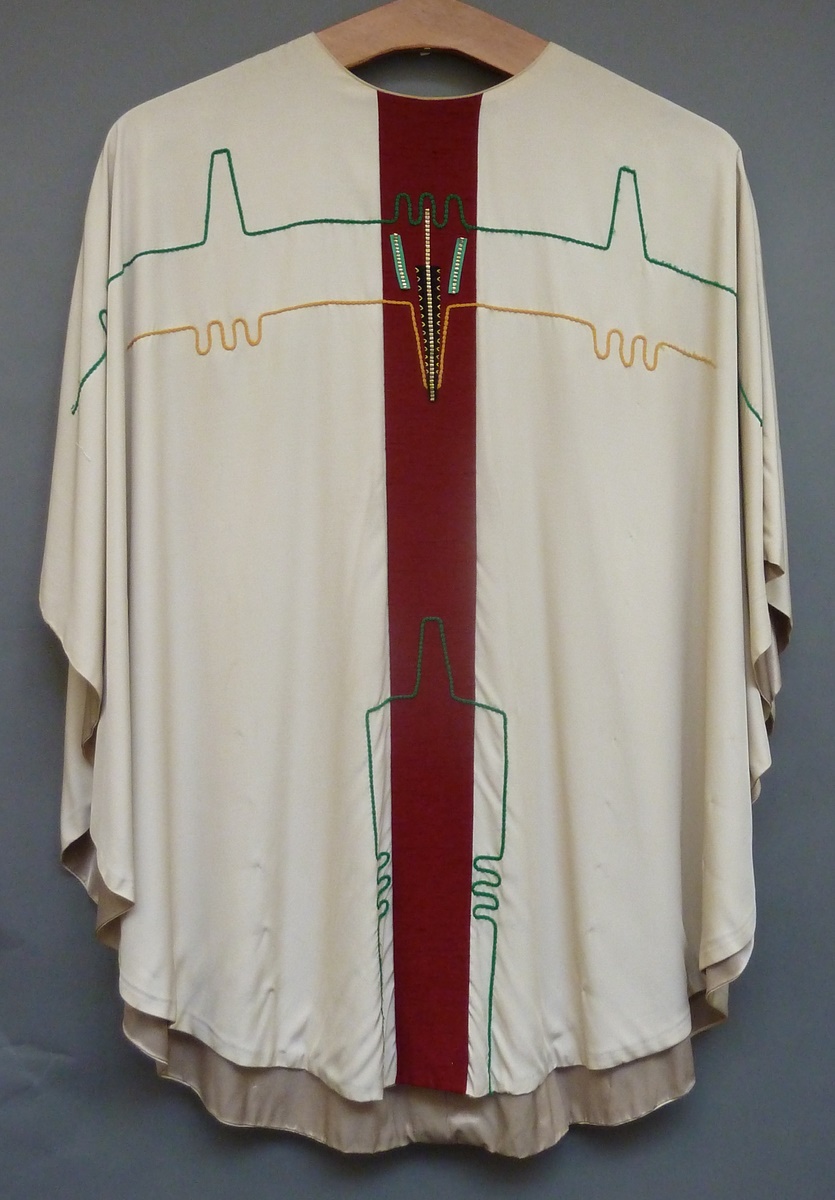 Wit kazuifel met rode baan met geel en groen borduursel