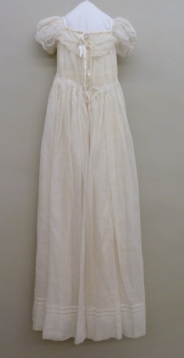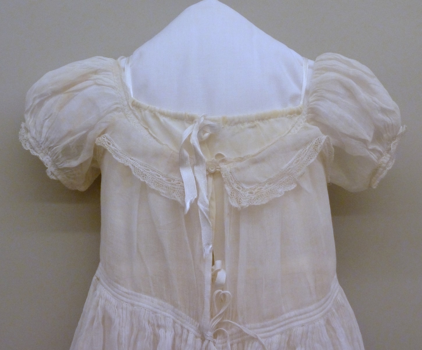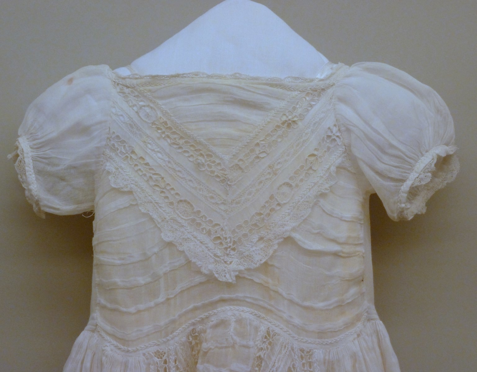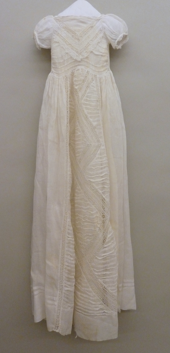 Doopjurk, rugpand met opengewerkte elkaar kruisende banen en met horizontale witte lijnen
