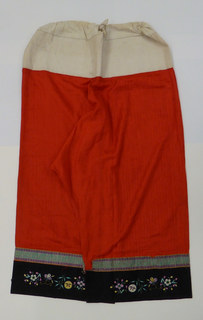 Rode mandarijnenbroek met aan onderzijde een zwarte baan met geborduurde florale motieven