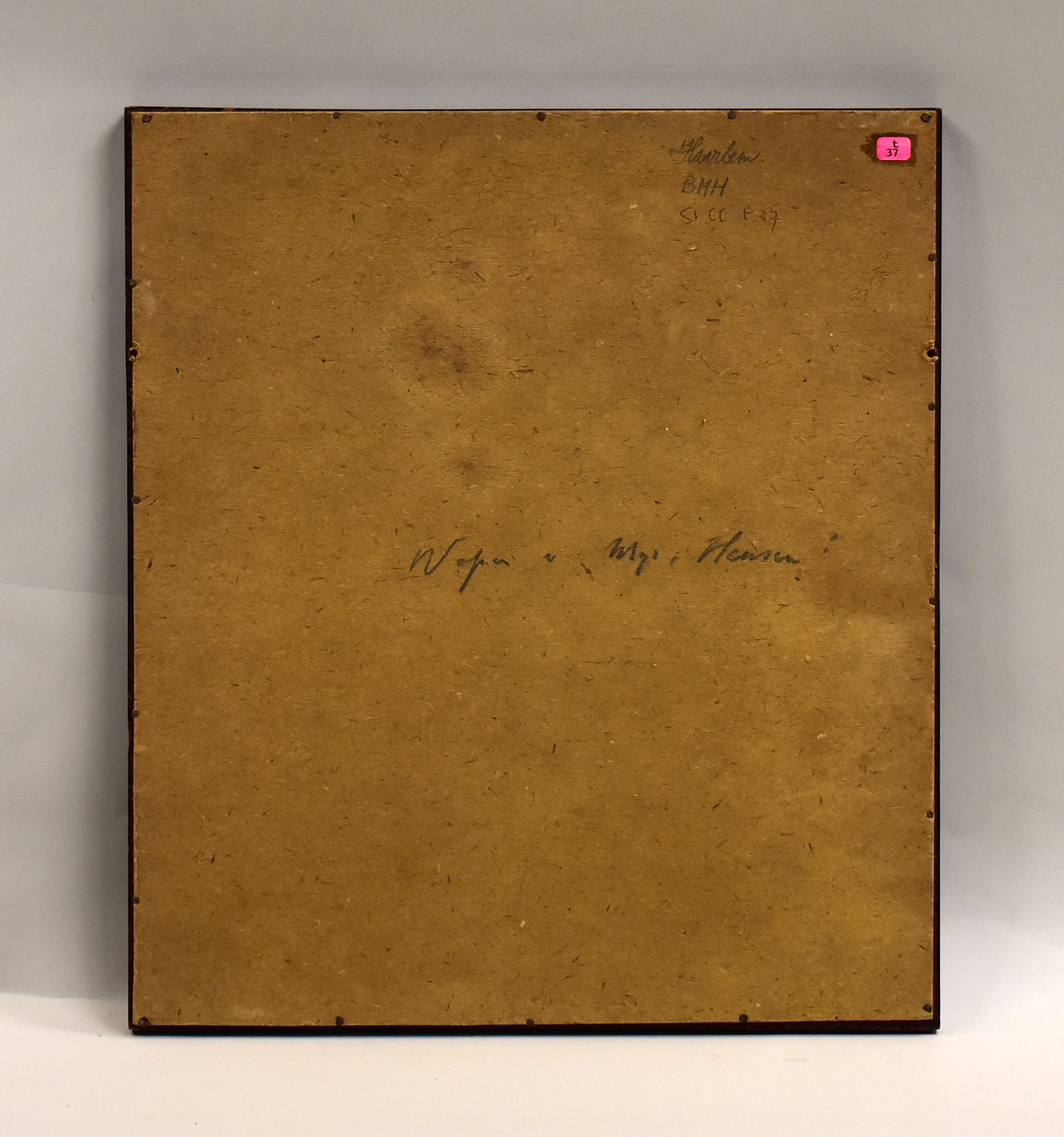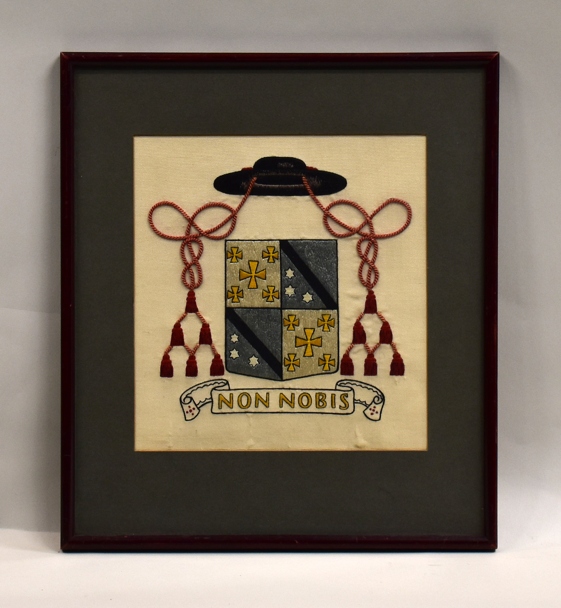 Borduurwerk achter glas met prelatenhoed en wapen Mgr. Antonius Hubertus Leonardus Hensen, met "Non nobis"