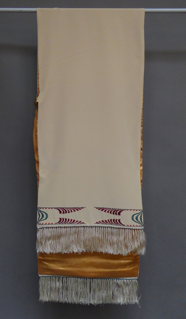 Wit schoudervelum met grof geborduurde versiering in rood en blauwgroen