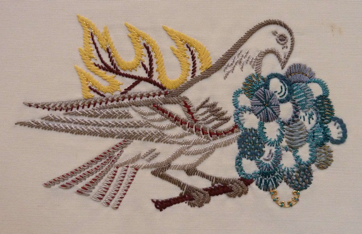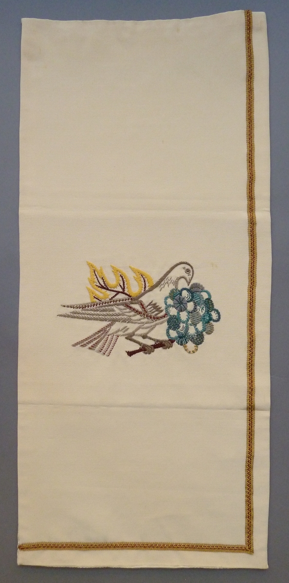 Rechterdeel van wit antependium met grof geborduurde duif