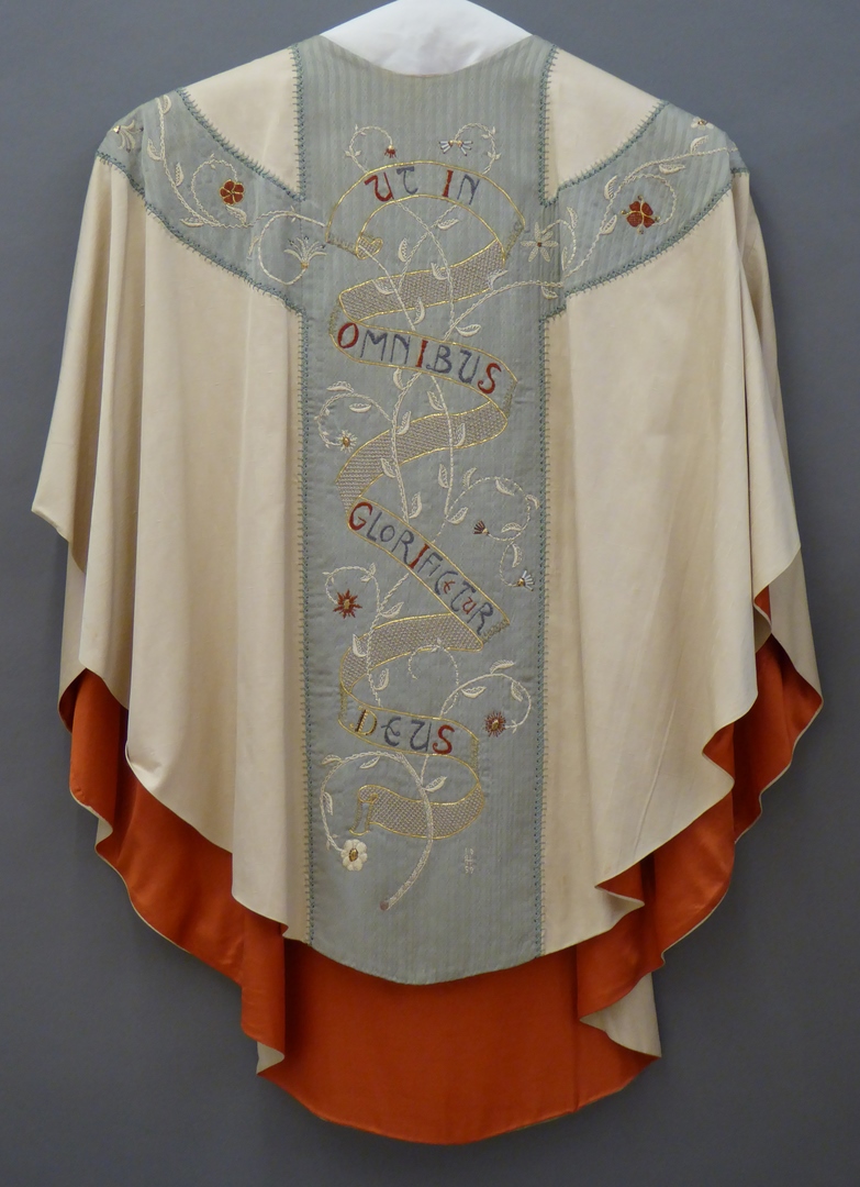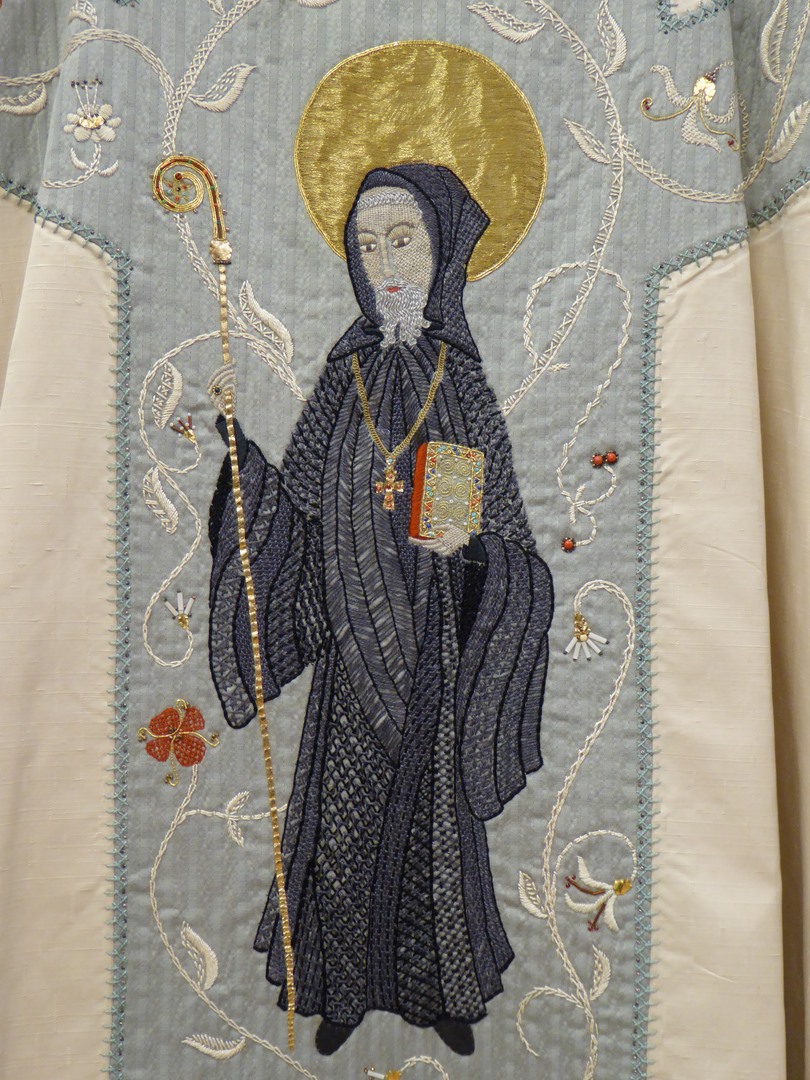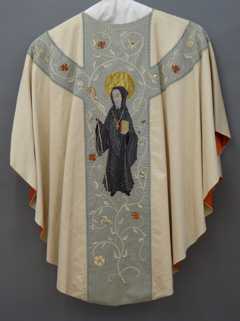 Wit gotisch kazuifel met H. Benedictus met staf, voor zijde met "Ut in omnibus glorificetur Deus"