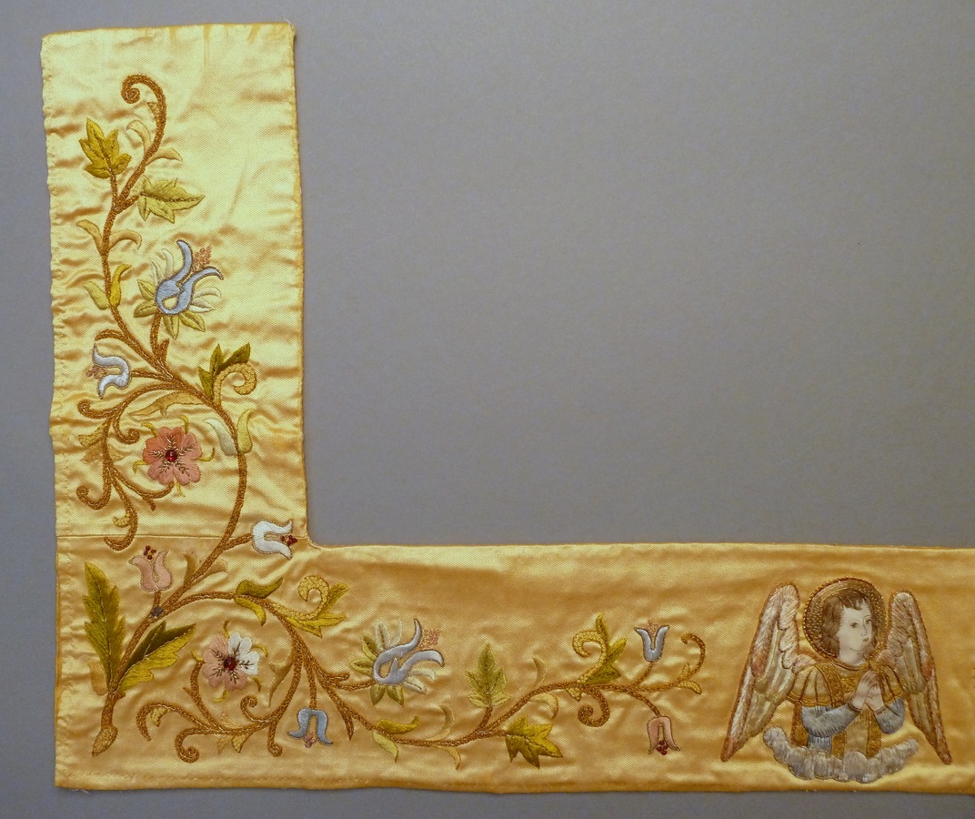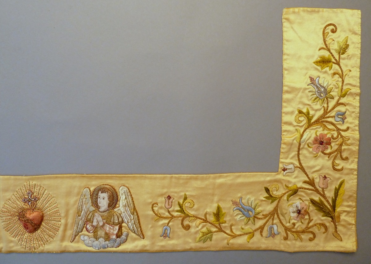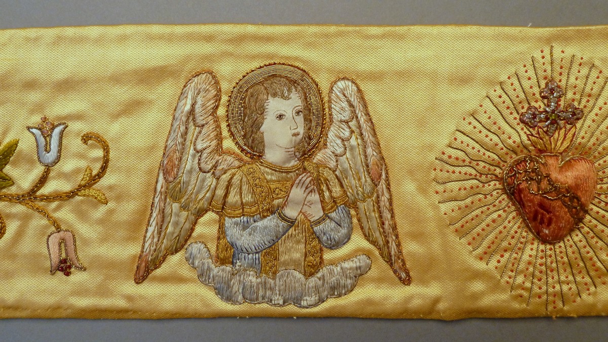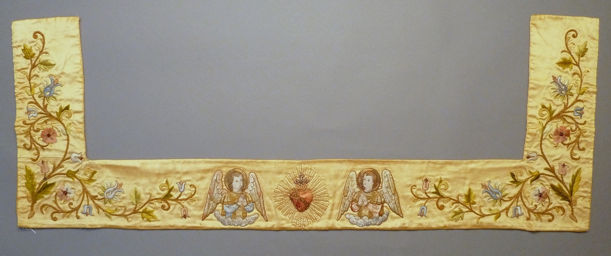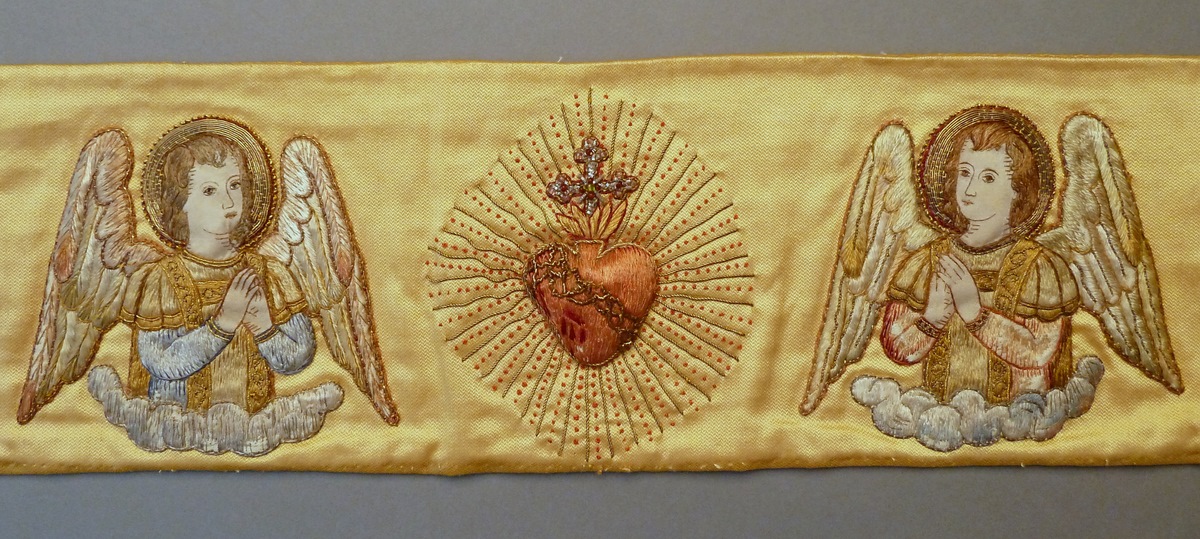 Borduurfragment van altaardwaal met stralend H. Hart en twee engeltjes