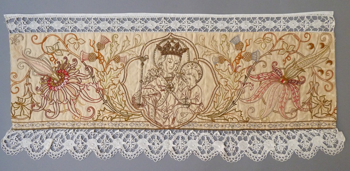 Geborduurde strook met Maria met kind, met gehaakte randen