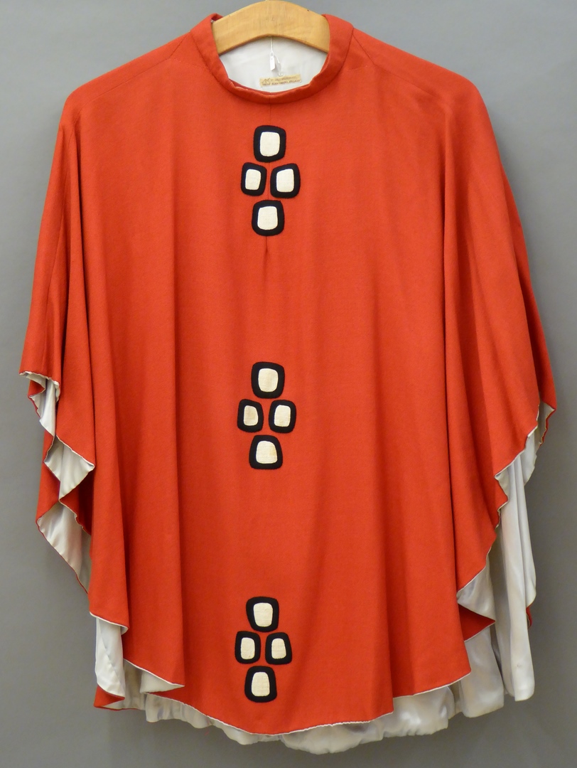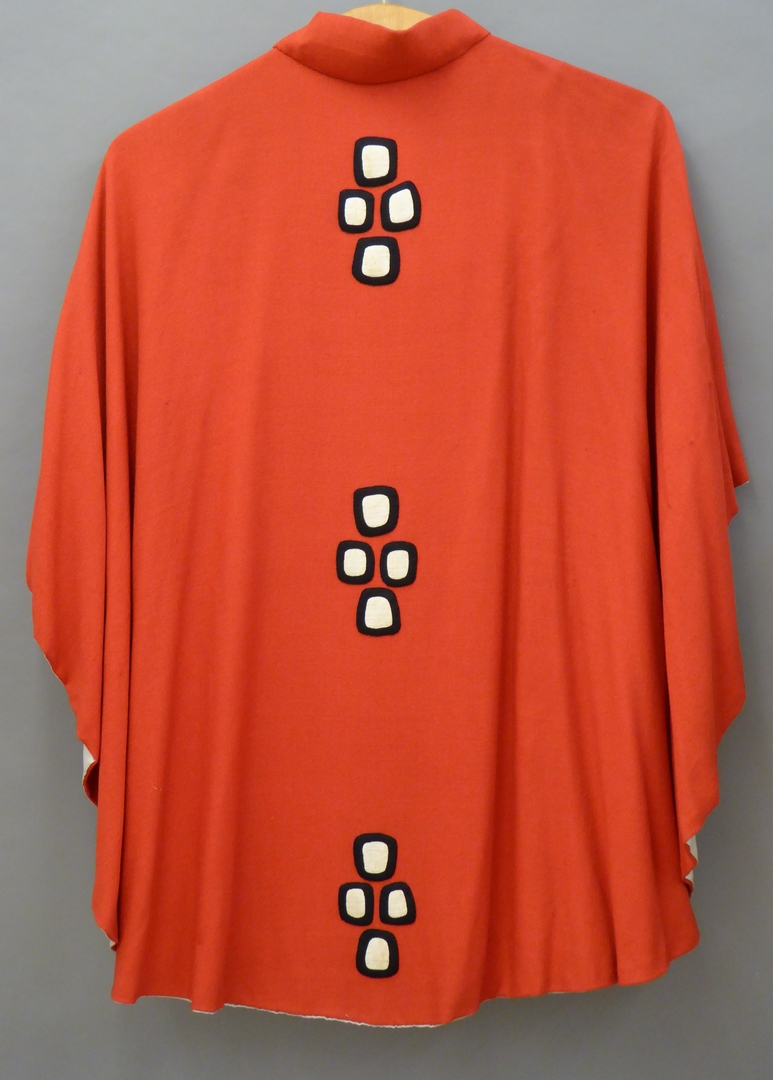 Rode mantelkazuifel met drie kruisjes opgebouwd uit vier zwart-witte blokjes