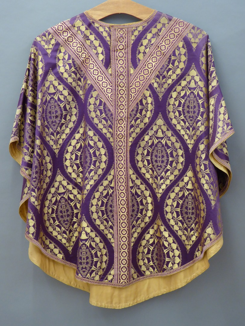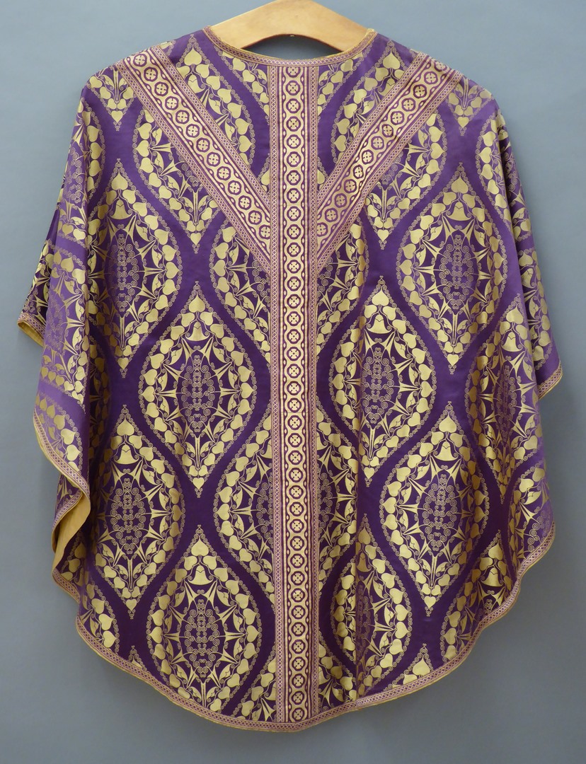 Paarse mantelkazuifel met ingeweven bladmotieven en gaffelkruis met gestileerde kruisjes