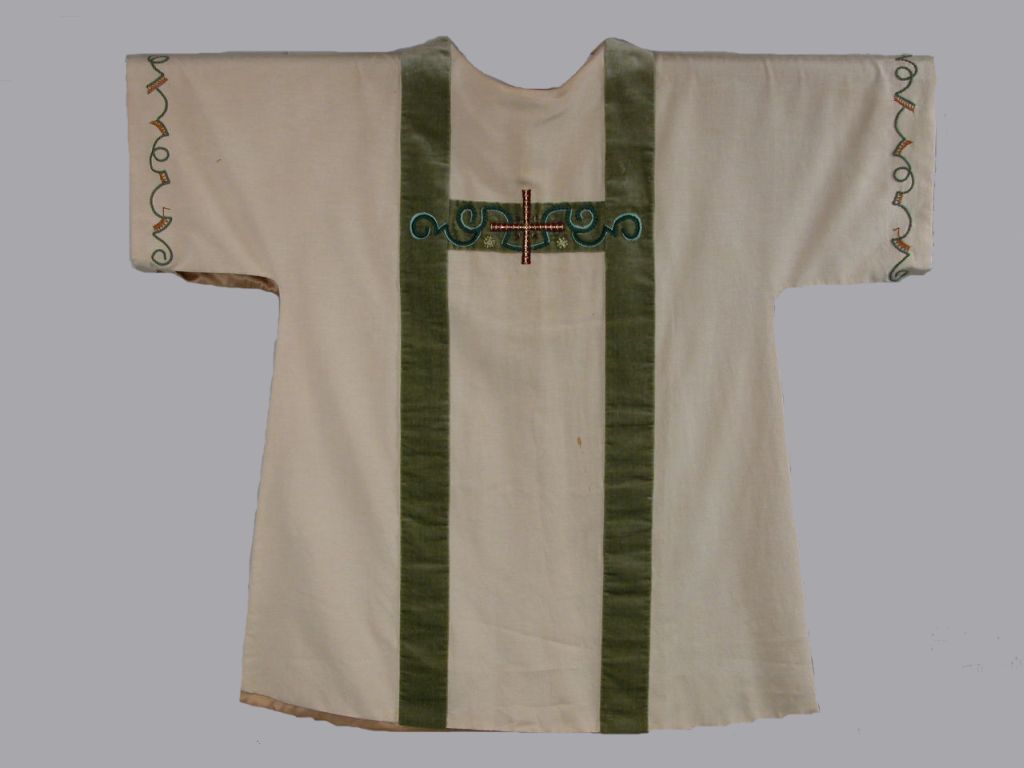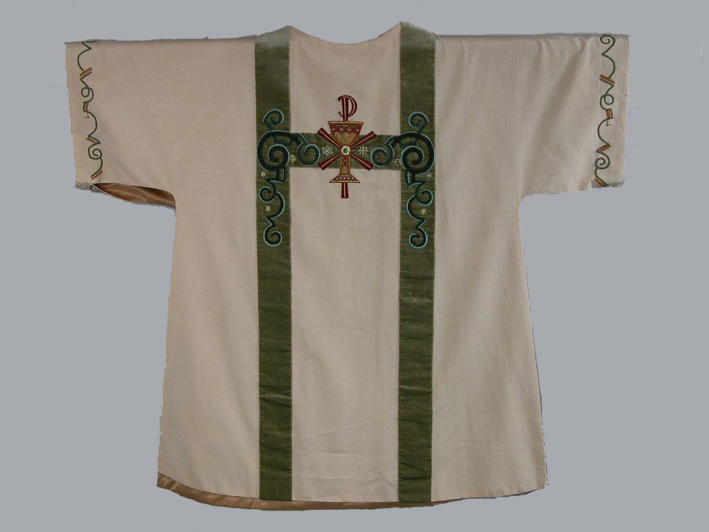 Witte dalmatiek met Christusmonogram waarvoor een kelk