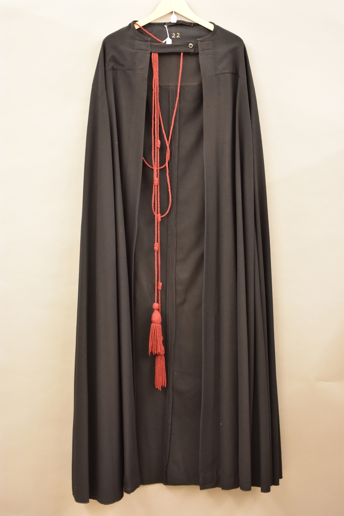 Ordekleding van de Kanunnikessen van het Heilig Graf: zwarte mantel met links rood patriarchaal kruis, waaraan bevestigd rood koord met vijf knopen