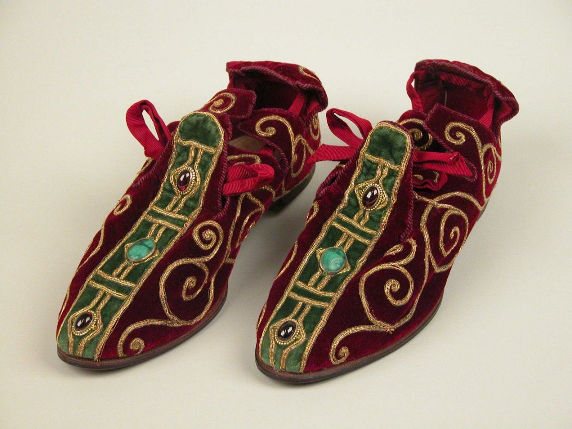 Rode pontificale linkerschoen, met groene band met drie stenen, kopie naar pantoffels van Thomas Beckett