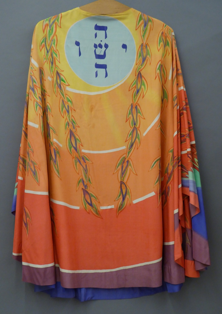 Oranje kazuifel, zogenaamd 'brandend braambos' in regenboogkleuren, op achterzijde een cirkel met daarin Hebreeuwse tekens