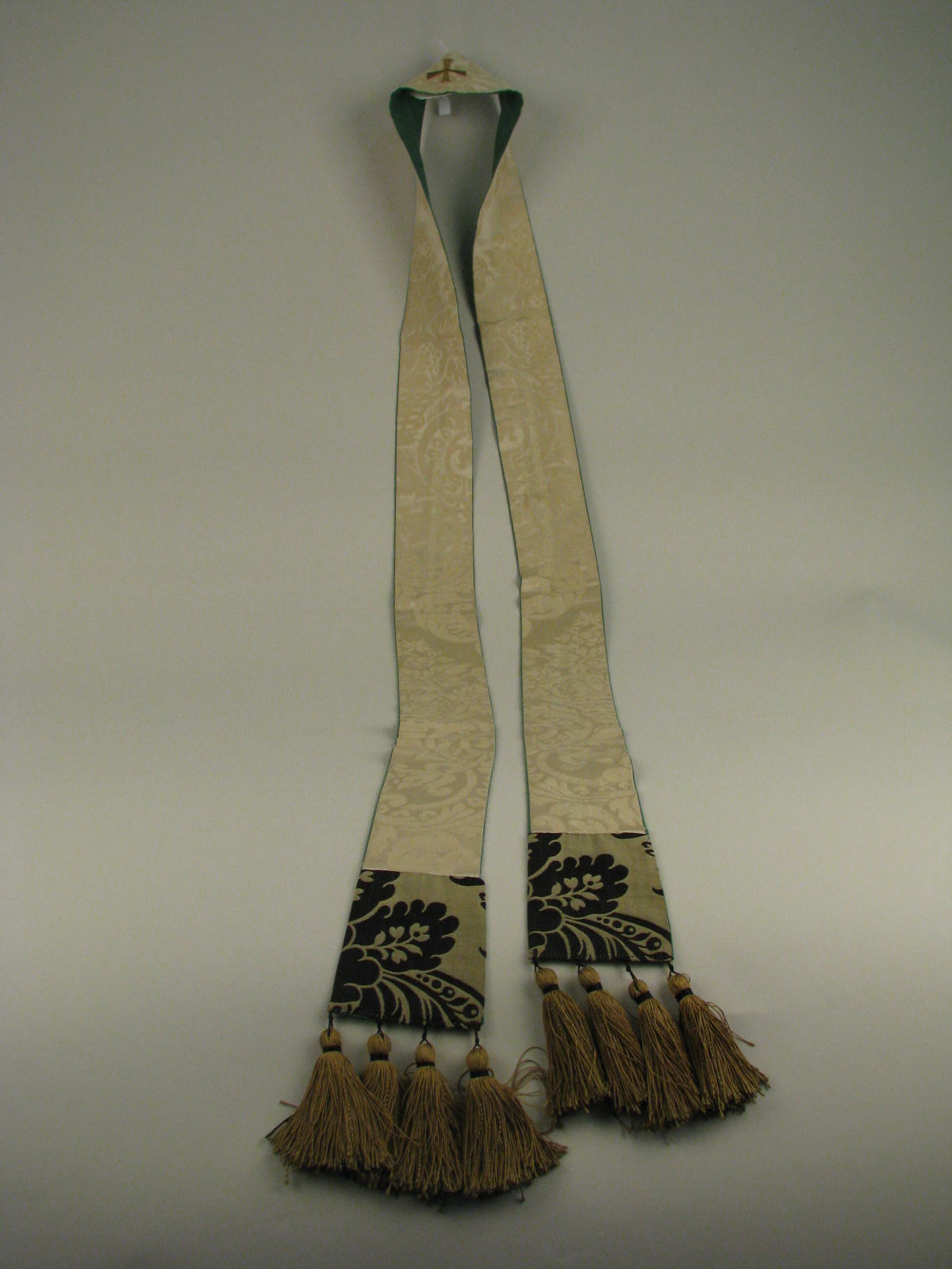 Crèmekleurige stola van damast met bloemtuilpatroon met geborduurd kruis en onderaan zwarte strook, met vier kwasten aan uiteinden