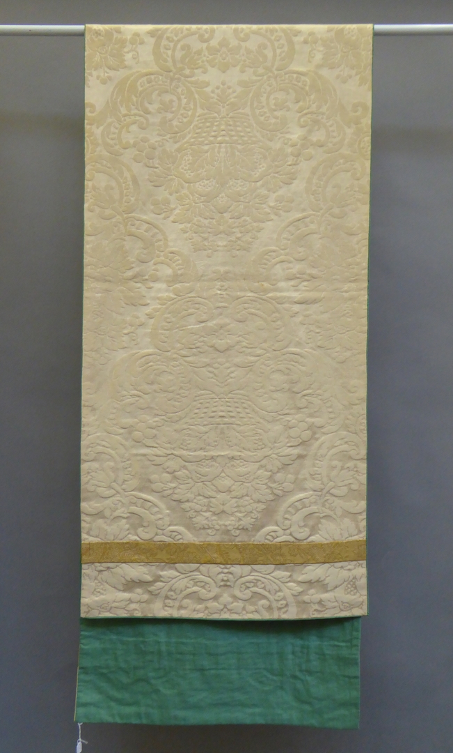Crèmekleurig schoudervelum van damast met bloemtuilpatroon met goudbrokaten stroken en groene voering