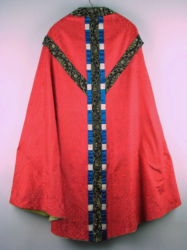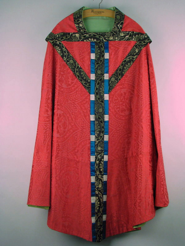 Rood kazuifel van zijdedamast met ingeweven medaillon- en bloemmotief, met zwarte en blauw-wit geblokte stroken en groene voering