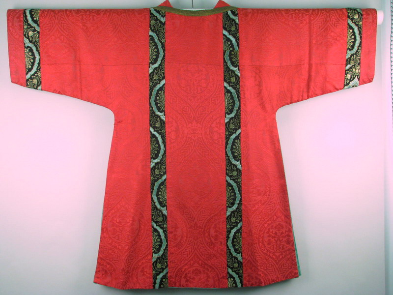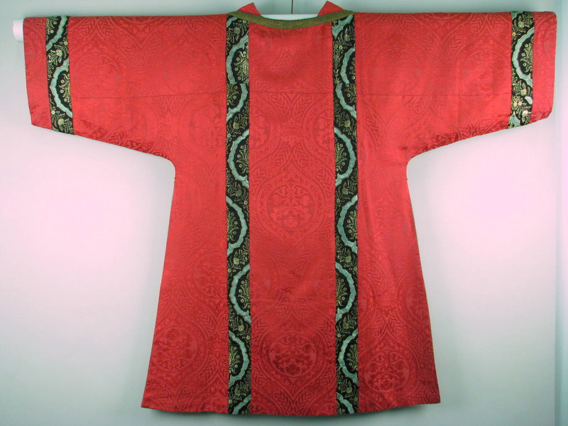 Rode tuniek van zijdedamast met ingeweven medaillon- en bloemmotief, goudkleurig passement, zwart/blauw brokaten stroken en zeegroene voering