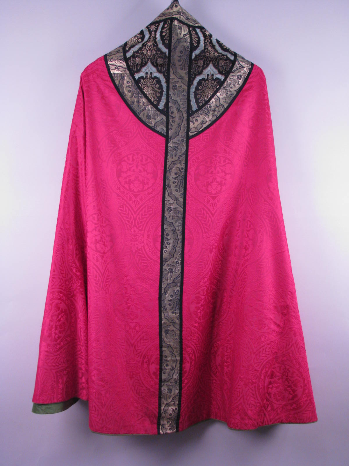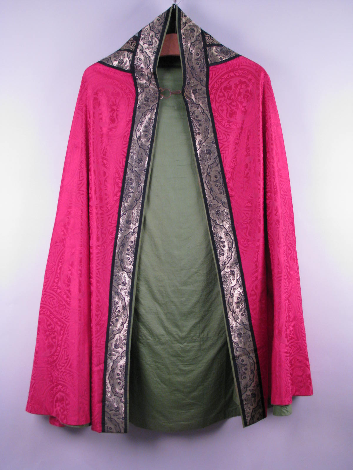 Rode koorkap van zijdedamast met medaillon- en bloemmotief, op de achterzijde een gaffelkruis, zwart brokaten en zwart/blauw brokaten stroken en groene voering, voor voorzanger