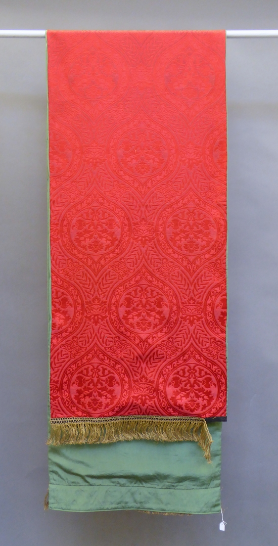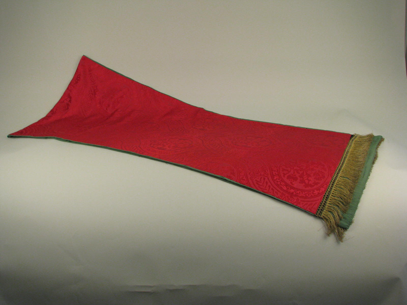 Rood schoudervelum van zijdedamast met medaillon- en bloemmotief, groene voering en langs de smalle zijden goudkleurige franje op zwarte band