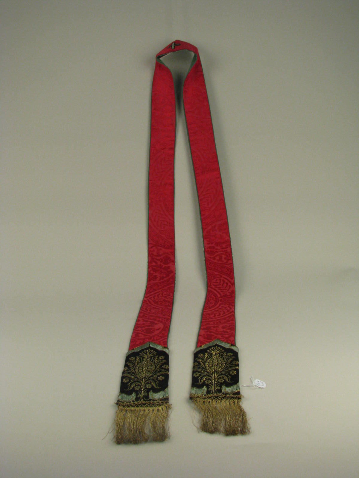 Rode stola van zijdedamast met medaillon- en bloemmotief in het midden een zwart/blauwgroen geborduurd kruis, aan de uiteinden een zwart/blauw brokaten medaillon, goudkleurige franje en groene voering