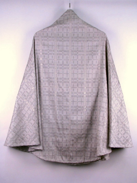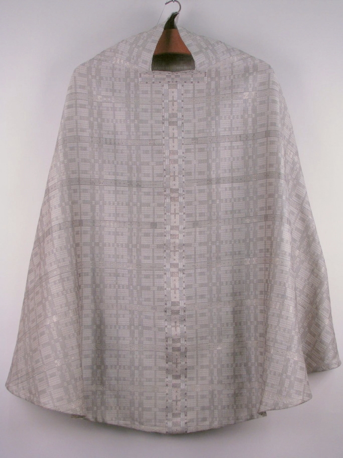 Grijs/wit geblokt kazuifel van handgeweven wol doorweven met goud- en zilverdraad