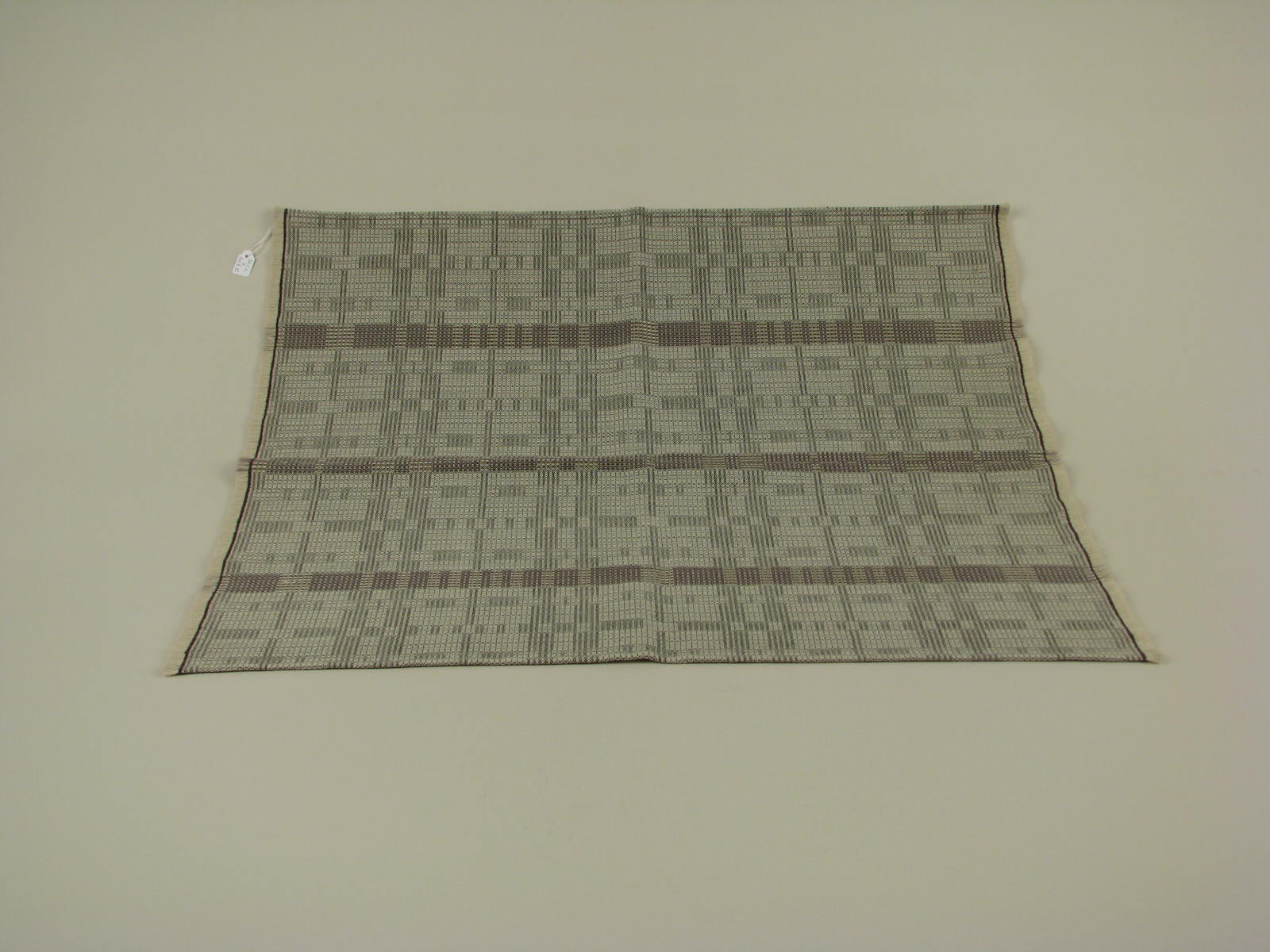 Grijs/wit geblokt kelkvelum van handgeweven wol doorweven met gouddraad, met rafelrand