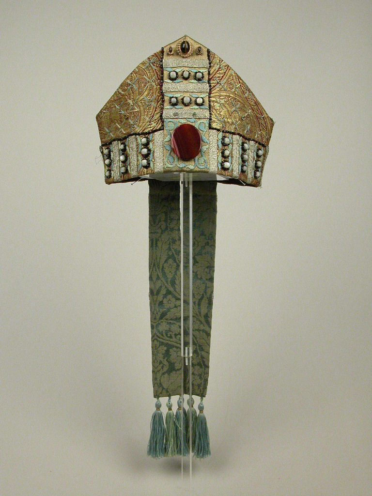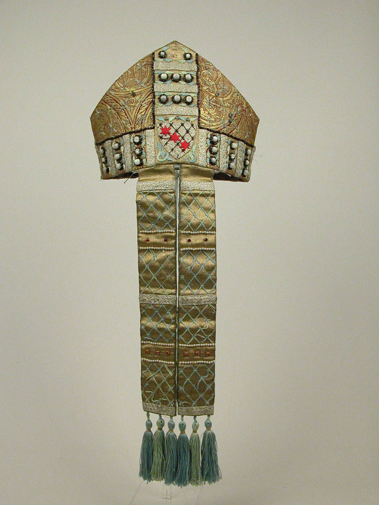 Abtsmijter van Dom Maximiliaan Mähler versierd met goudbrocaat, zilvergalon, borduurwerk, kralen van parelmoer en talrijke granaatkraaltjes, op de achterzijde zijn wapen