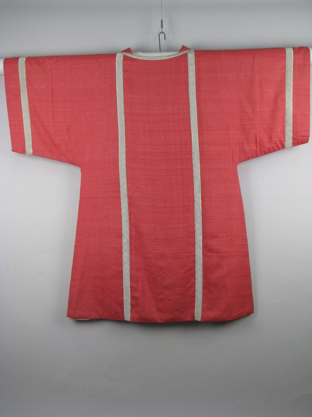 Tuniek van roze shantungzijde met aan voor- en achterzijde links en rechts lengtestroken van zilvergalon, langs de mouwen een rand van zilvergalon en crèmekleurige bourettezijde voering