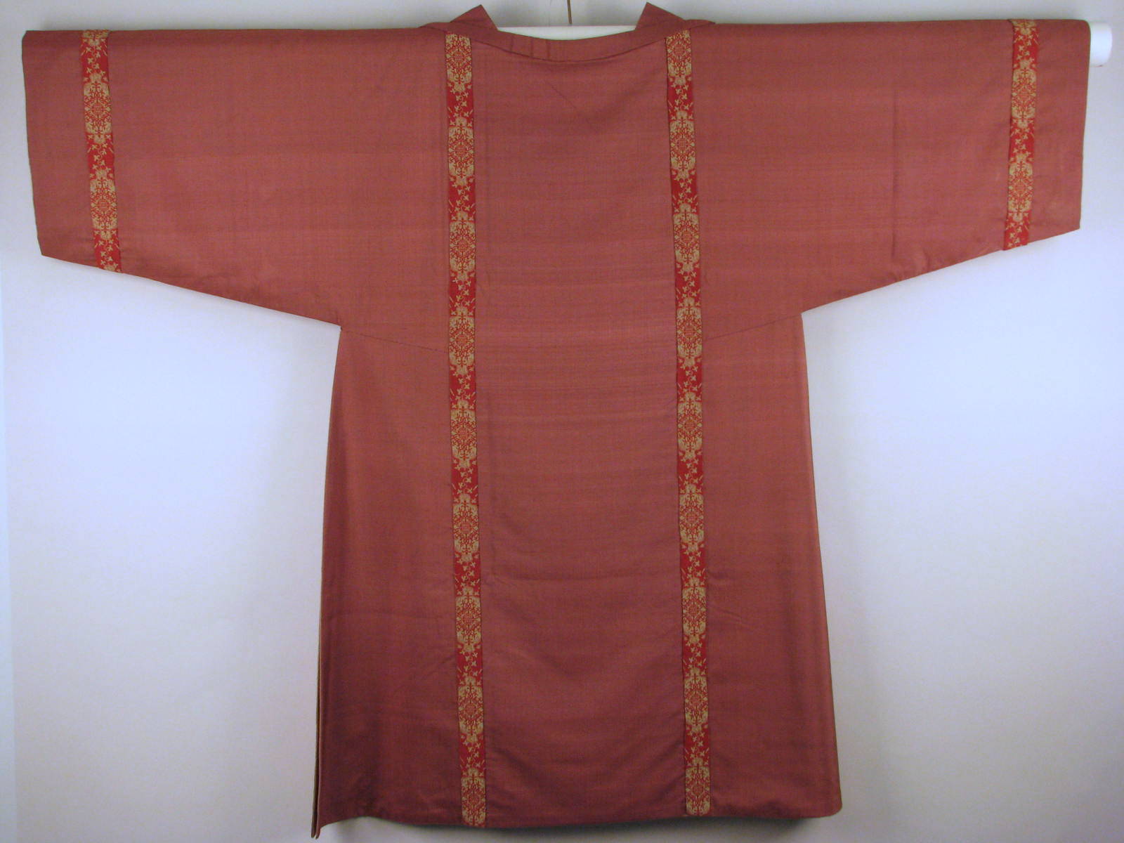 Tuniek van paarse shantungzijde met banen van geweven rode en goudkleurige wol