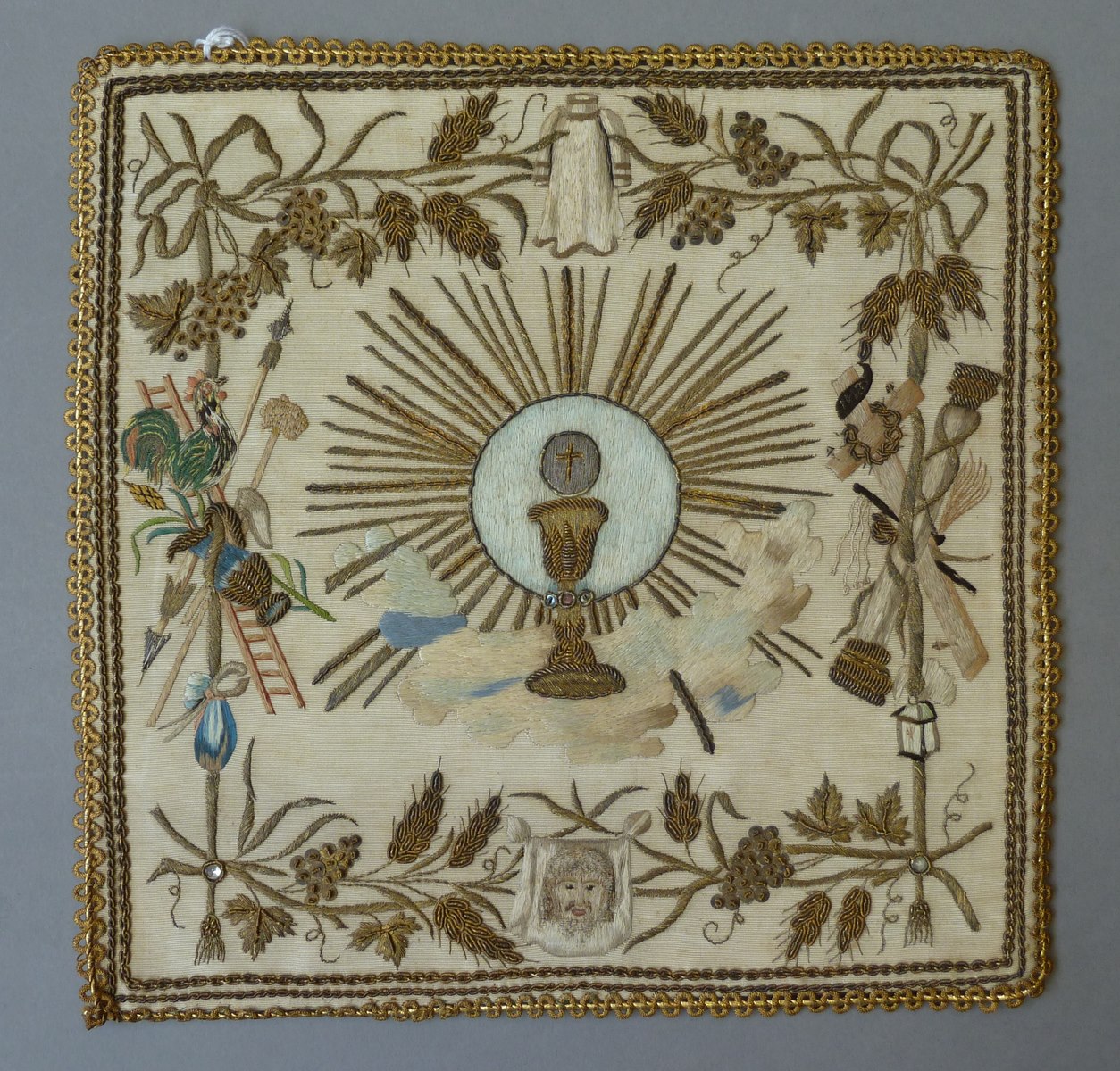 Witte palla met kelk, hostie en Arma Christi