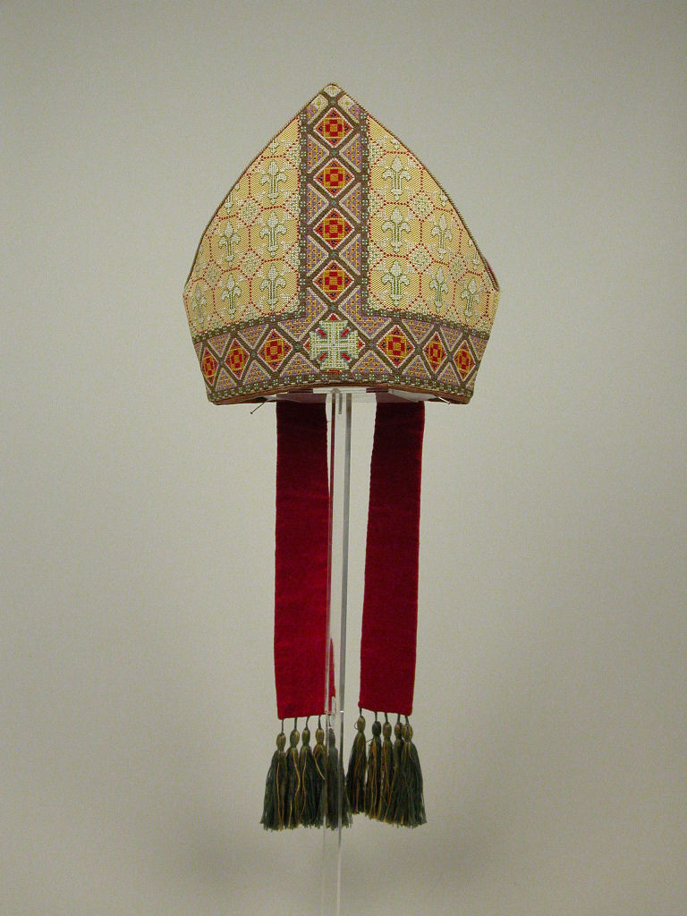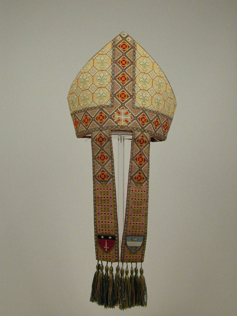 Gele mijter met Franse lelies en geometrische vormen, wapen van Dom Jean de Puniet op slip