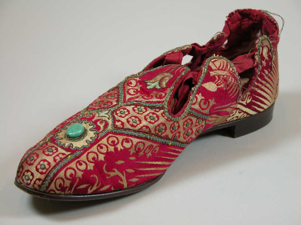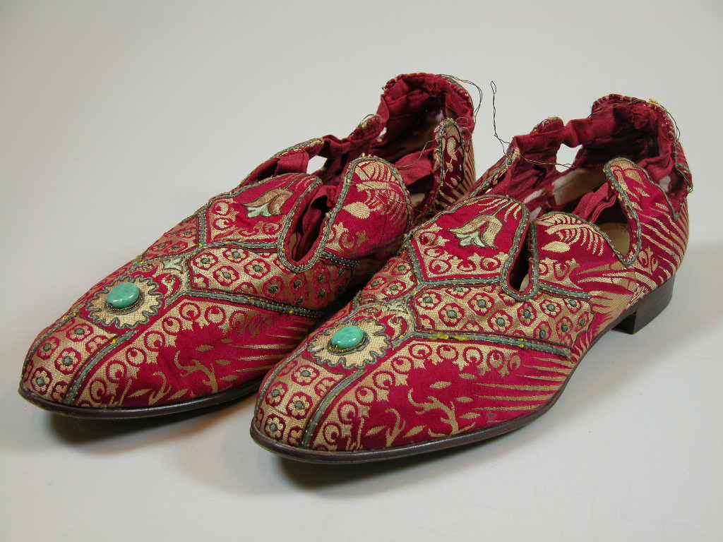 Rechterschoen van Dom Mähler van gedecoreerde rode stof met steen van jade