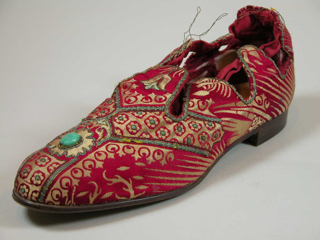 Linkerschoen van Dom Mähler van gedecoreerde rode stof met steen van jade