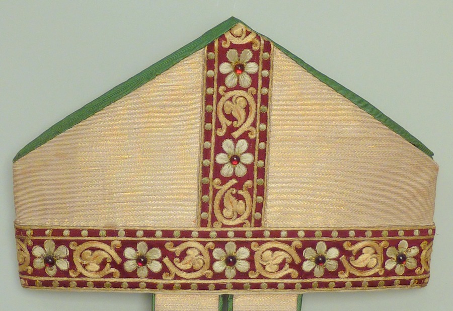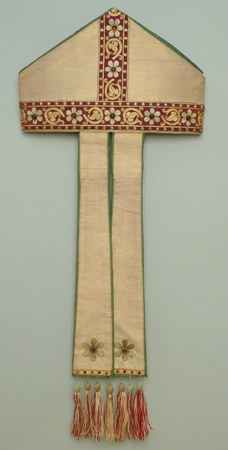 Mijter met bloem- en bladversieringen, halfedelstenen, leer en gouddraad