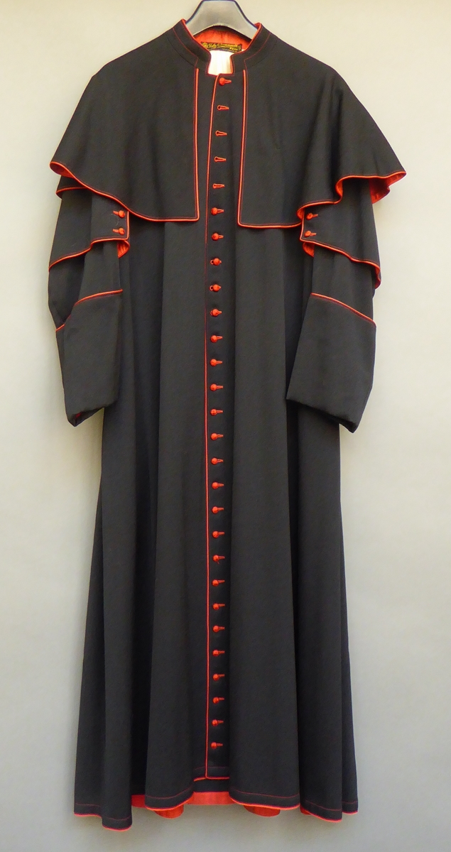 Zwarte toog met schoudermantel, afgezet met rode biezen, van kardinaal Willem Marinus van Rossum