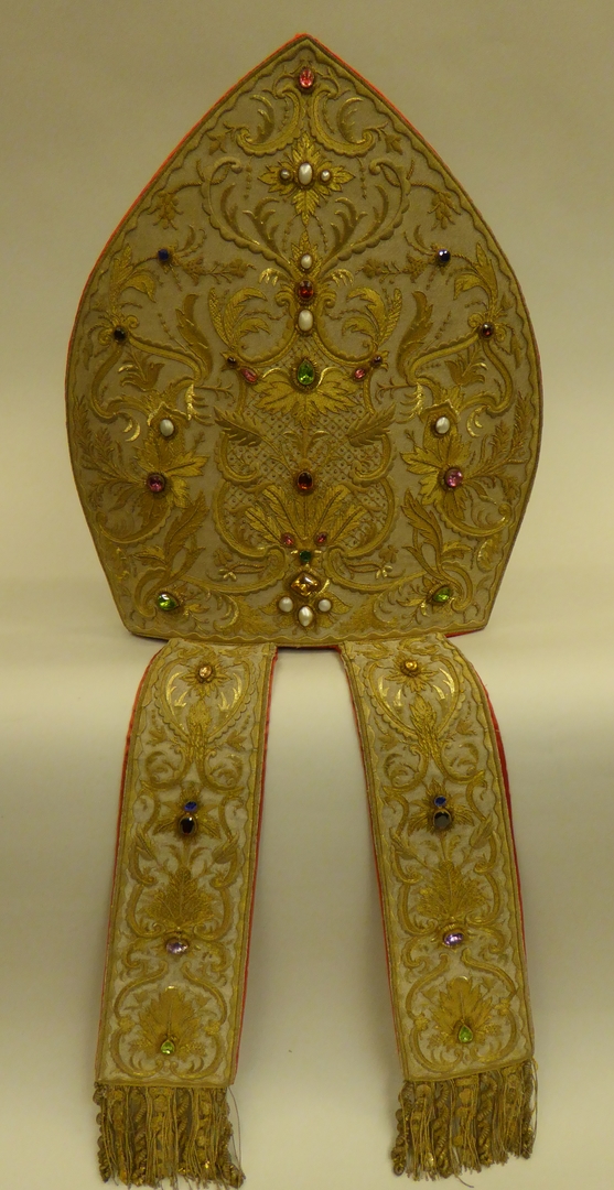 Witte mijter met goudborduursel van bladvoluten en Louis XVI-achtig traliewerk, bezet met glasstenen en parelmoer, van kardinaal Van Rossum. Gevoerd met rode zijde.