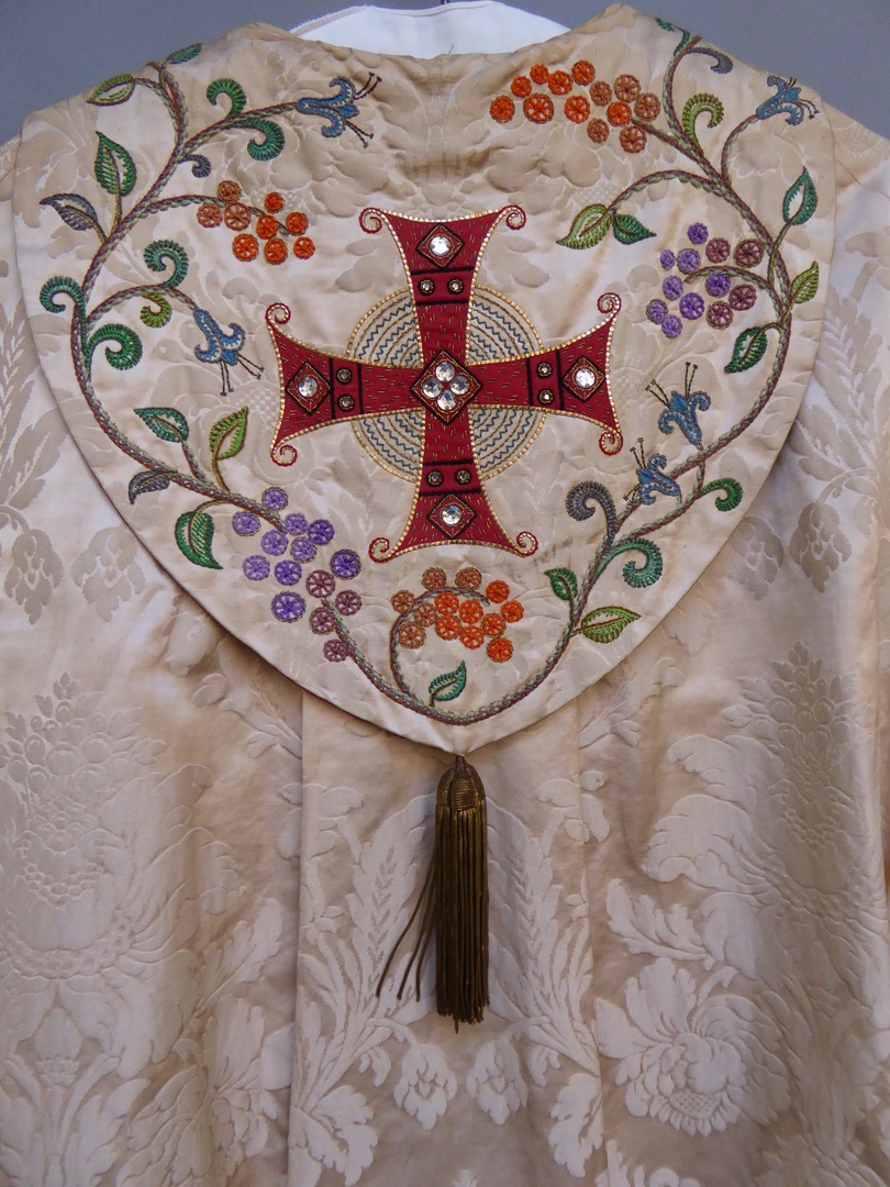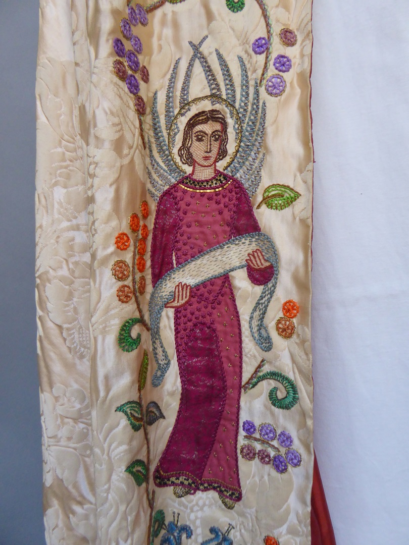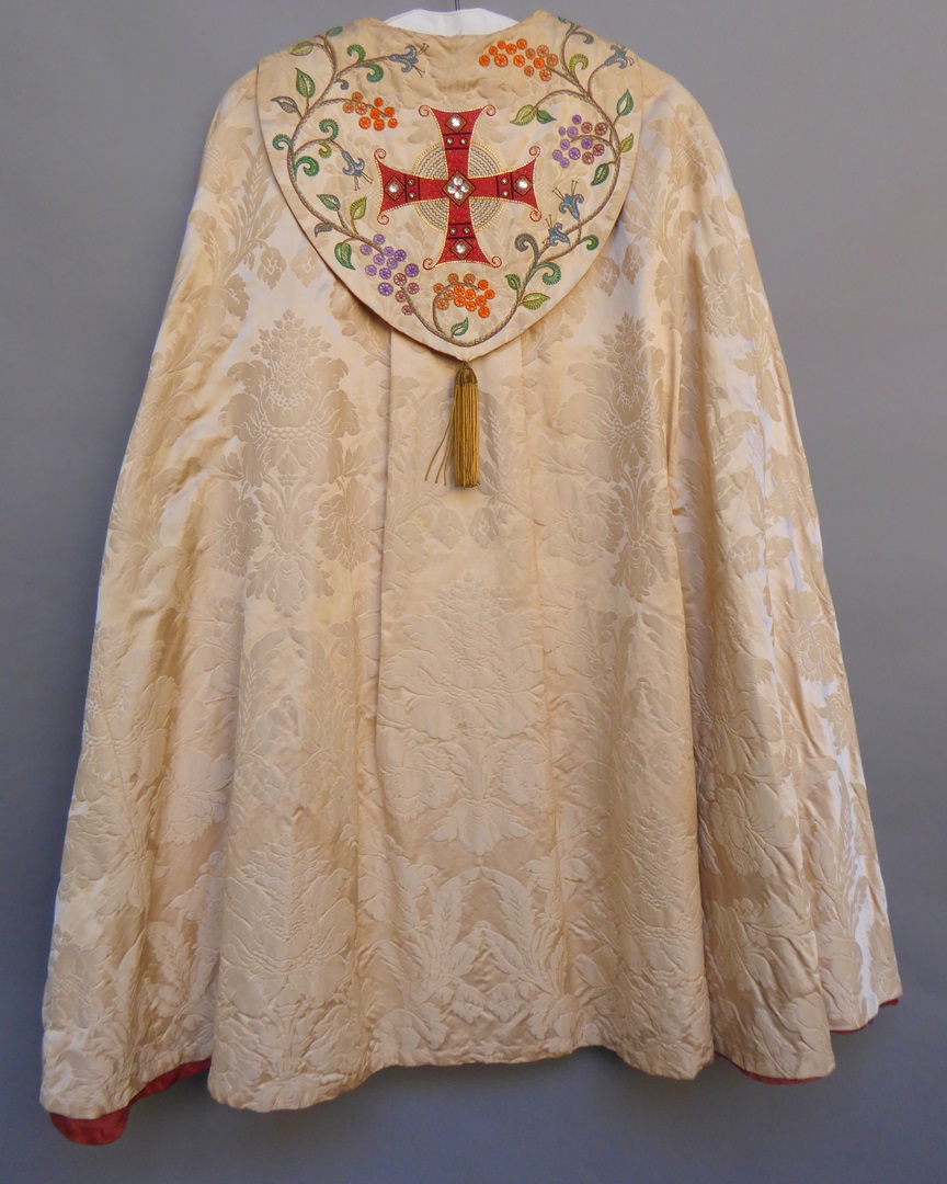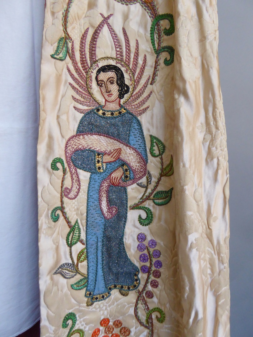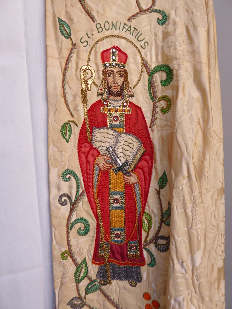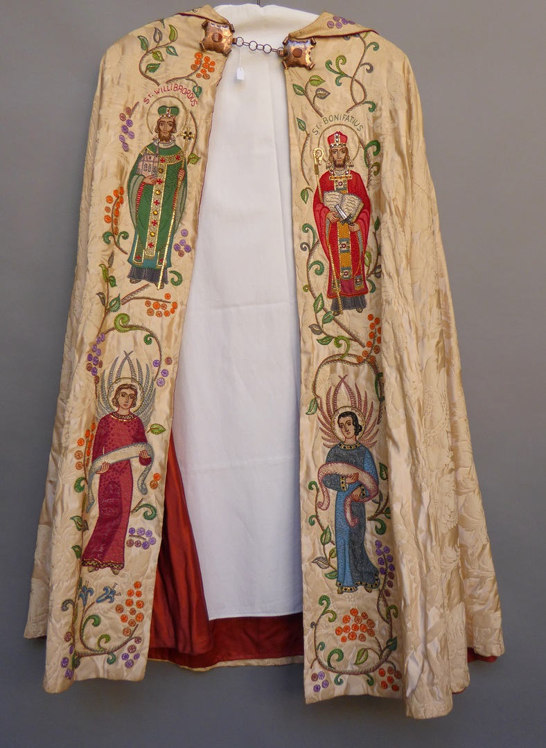 Crèmekleurige koorkap geborduurd met H. Willibrordus met "St. Willibrordus" en met H. Bonifatius met "St. Bonifatius" en twee engelen, kruis op schild