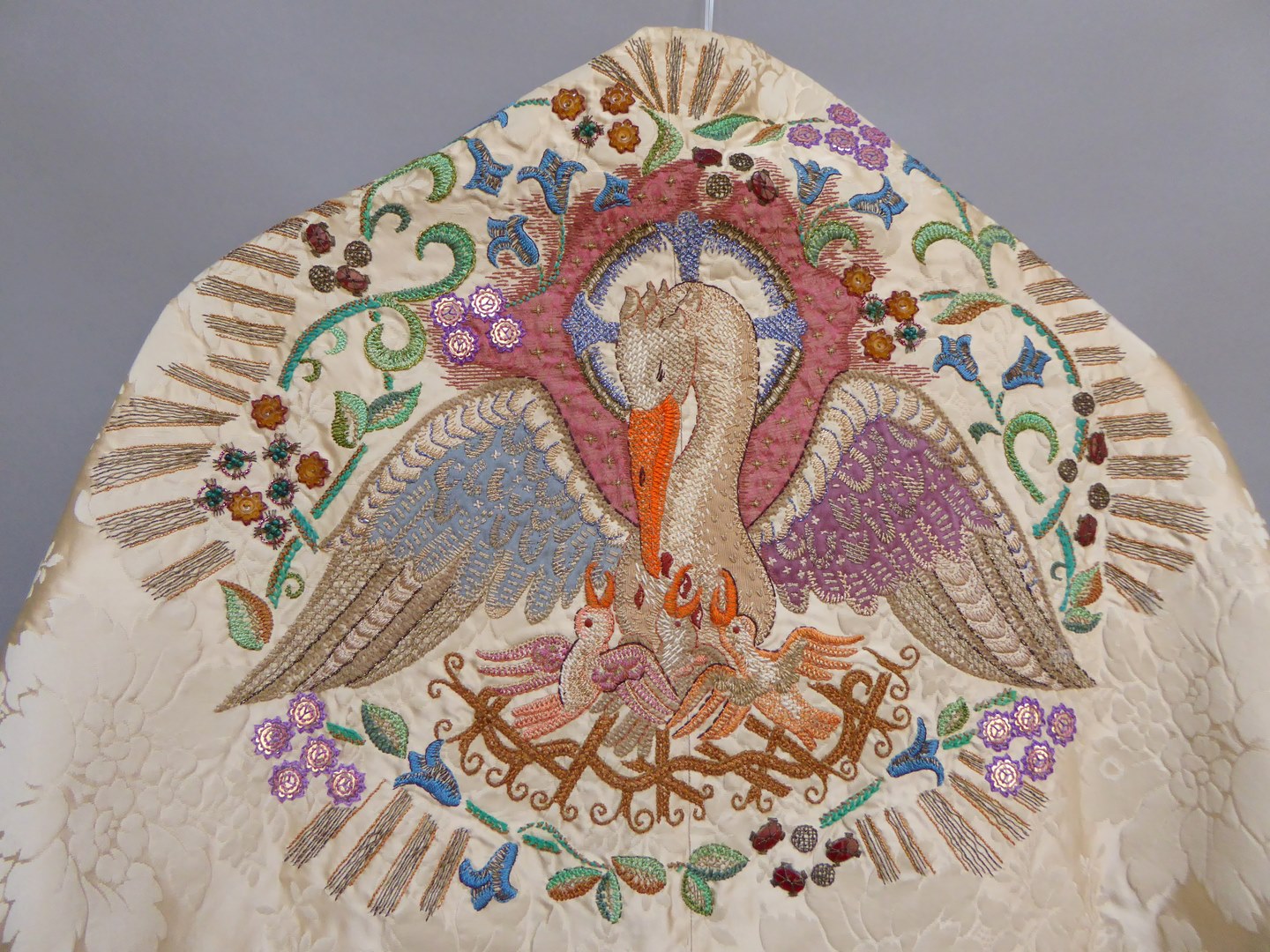 Crèmekleurig schoudervelum geborduurd met pelikaan met jongen