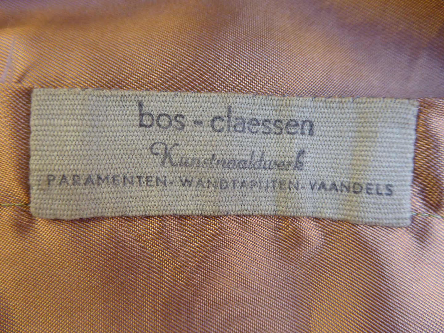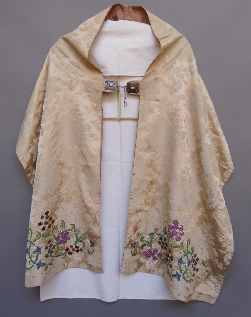 Crèmekleurig schoudervelum geborduurd met pelikaan met jongen Label op rand linkerzak met: Bos-Claessen / Kunstnaaldwerk / paramenten - wandtapijten - vaandels
