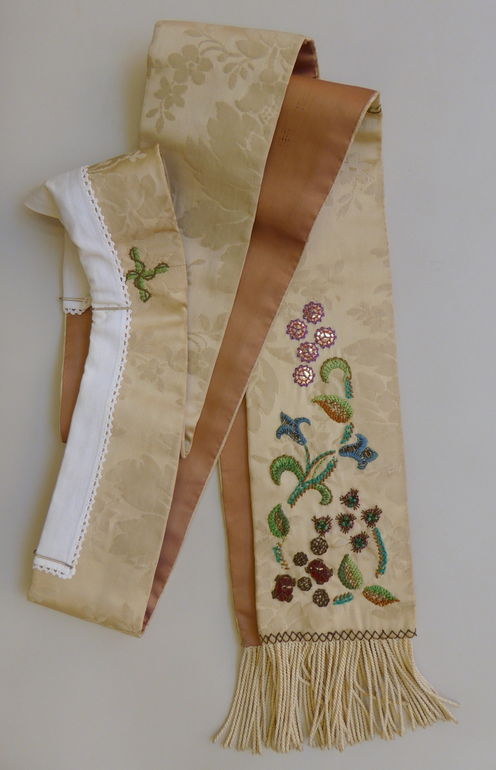 Crèmekleurige stola geborduurd met florale motieven aan uiteinden, met witte franje