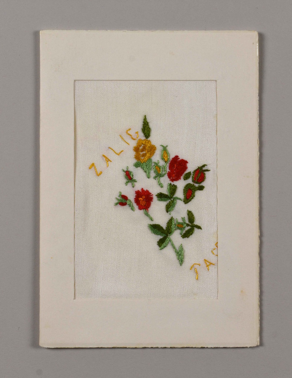 Paaskaart "Zalige Pasen" met boeket op witte grond geborduurd