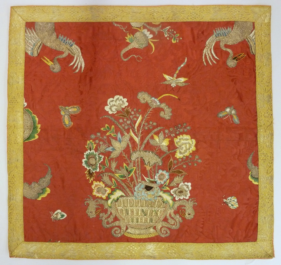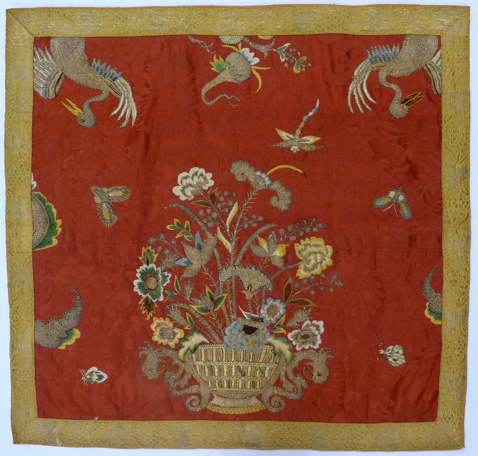 Rood velum met chinoiserie borduursel van bloemenmand, vlinders en kraanvogels