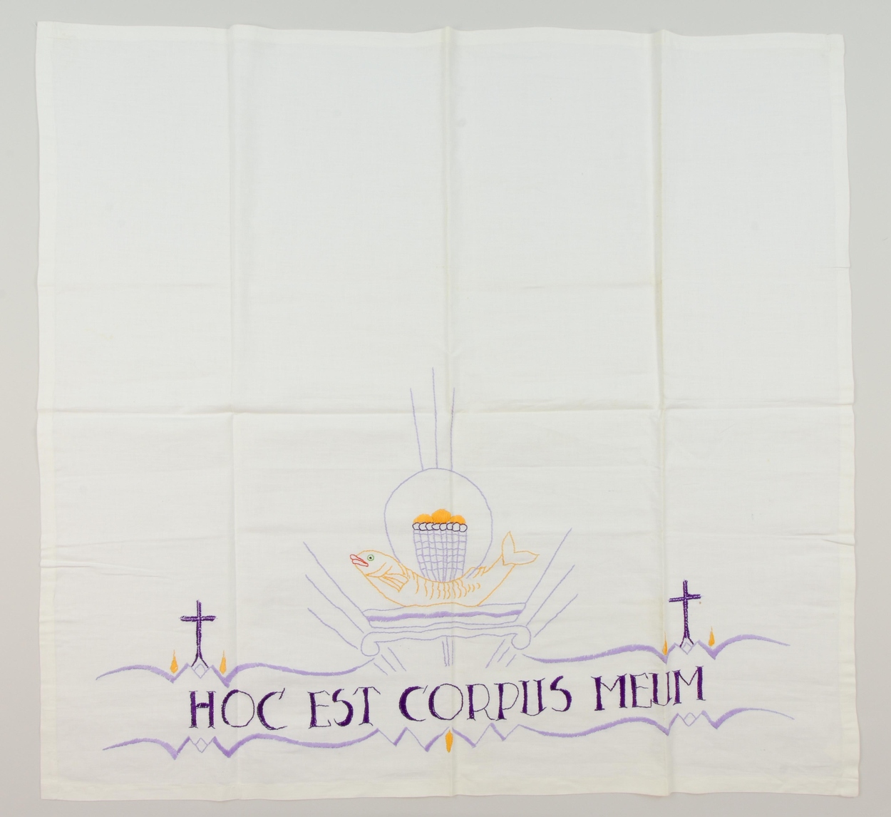 Communiedoek geborduurd met brood en vissen, met "Hoc est corpus meum"