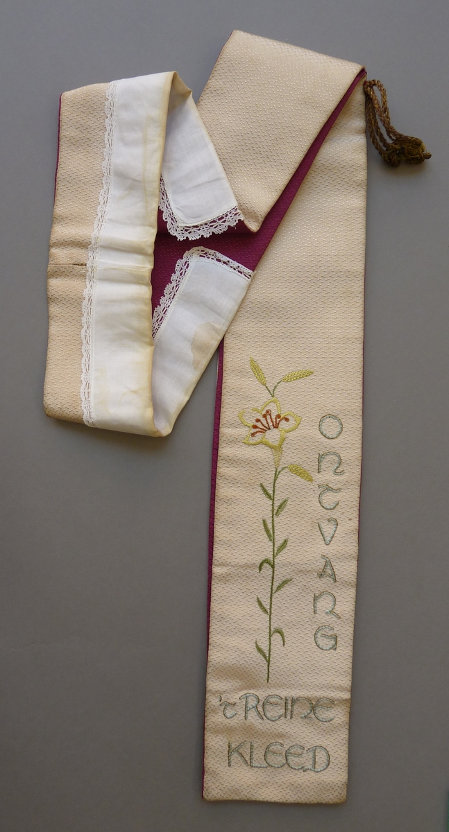 Paars-witte bedieningsstola geborduurd met respectievelijk kaars en duif