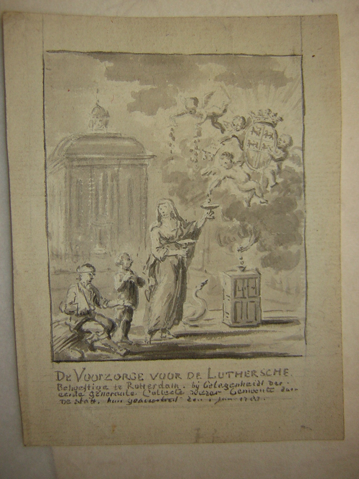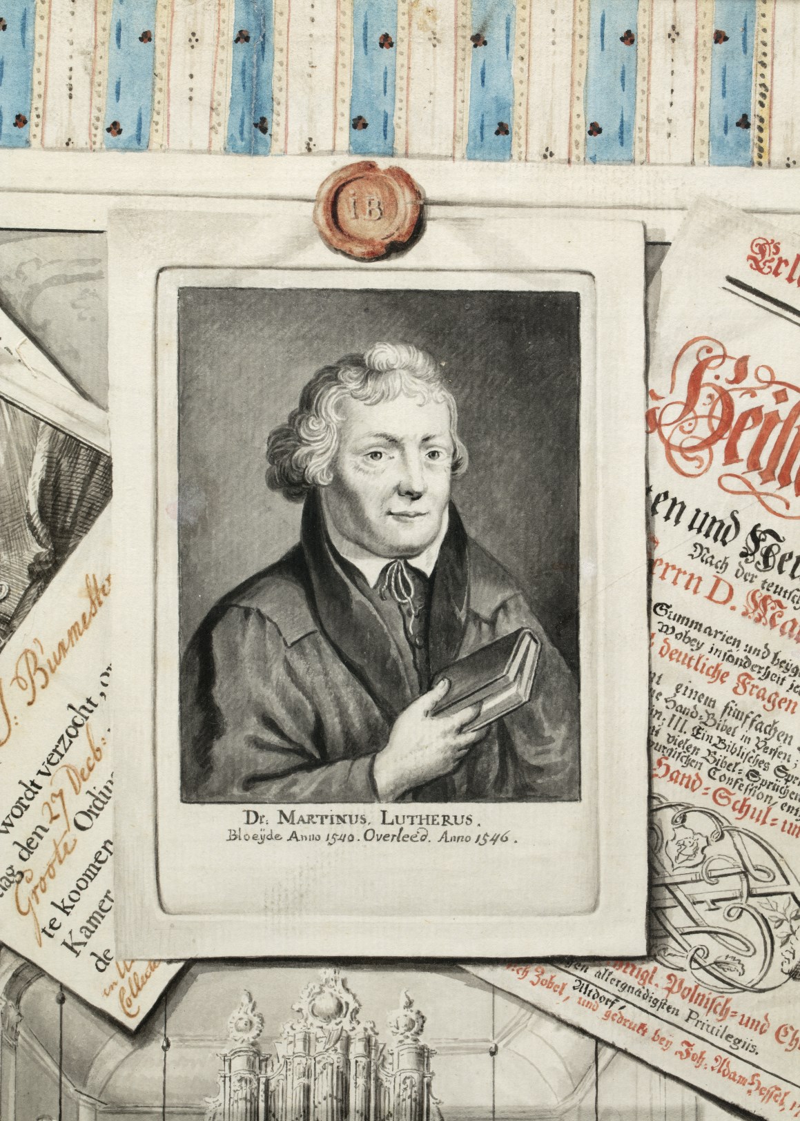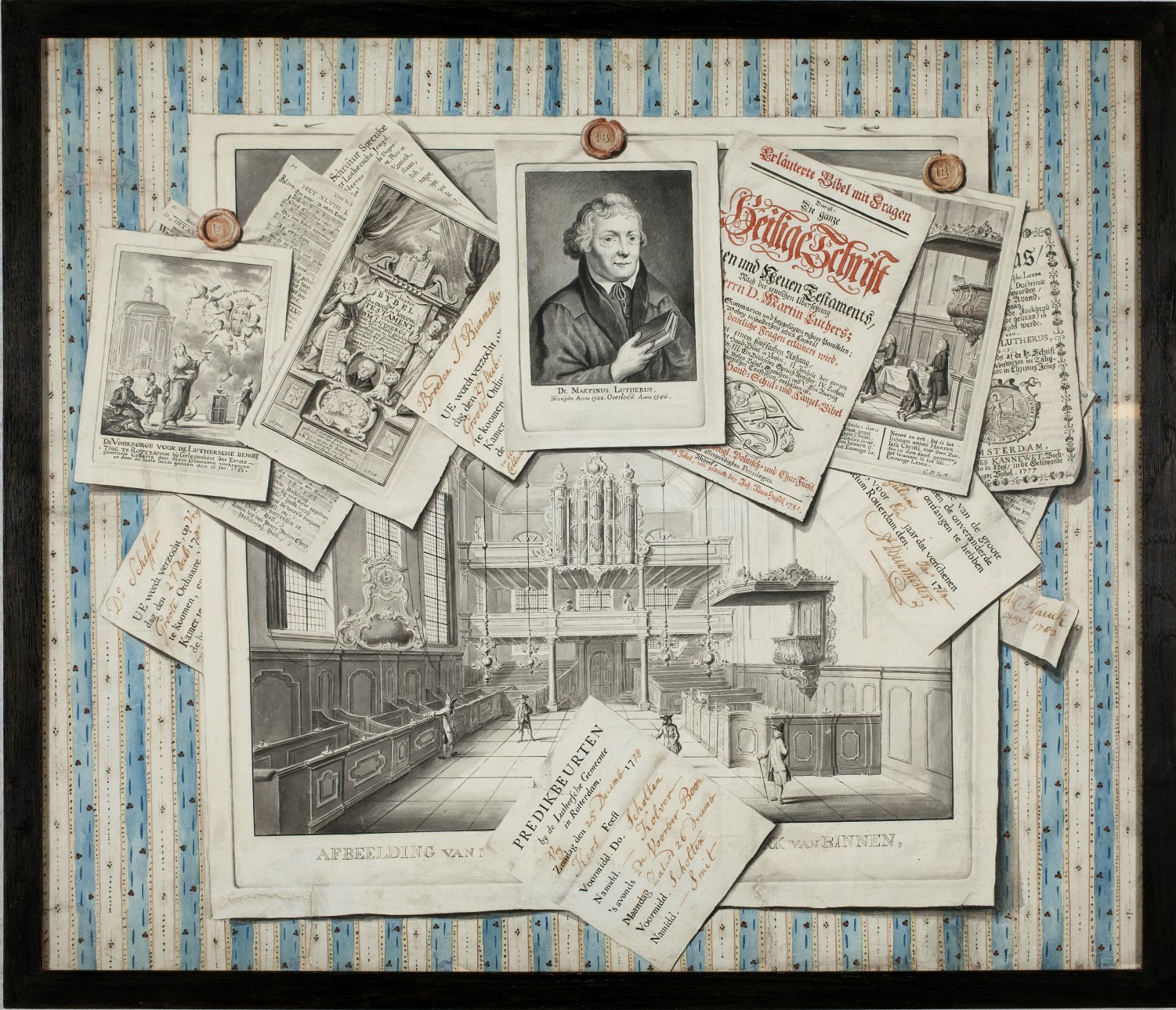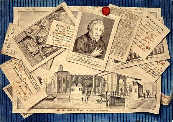 Boerenbedrieger voor lutheraan J. Burmester, met 'prenten op behang' van o.a. Luther, kerkinterieur