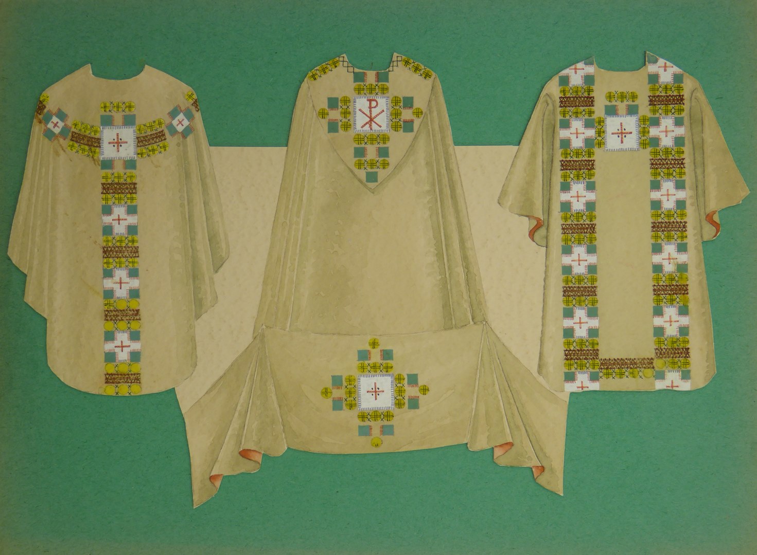 Ontwerp wit liturgisch ensemble (kazuifel, koorkap, dalmatiek, benedictievelum)