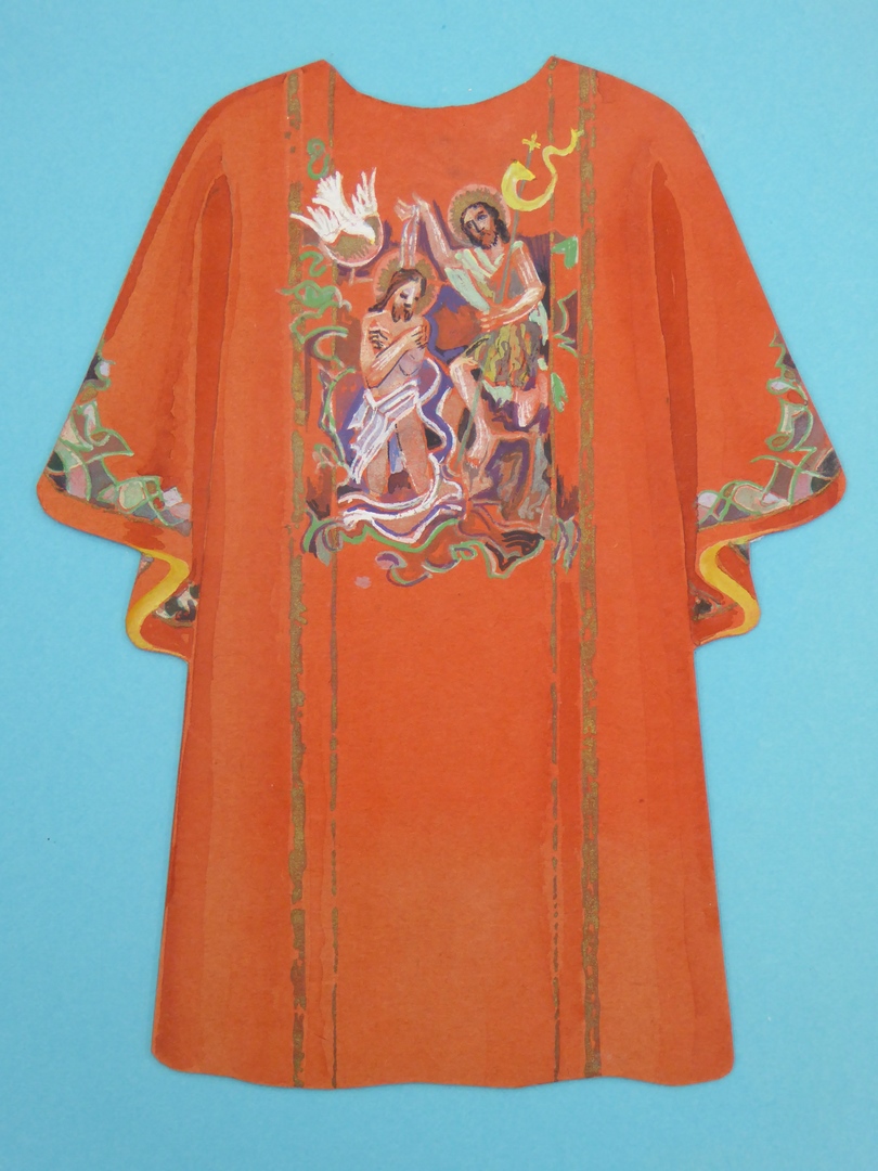 Ontwerp rode dalmatiek met doop van Christus in de Jordaan