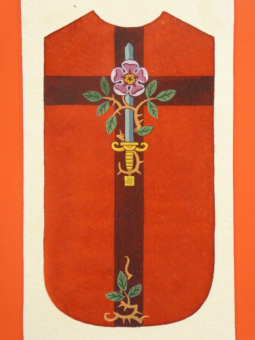 Ontwerp rood kazuifel met zwaard en erom een roos