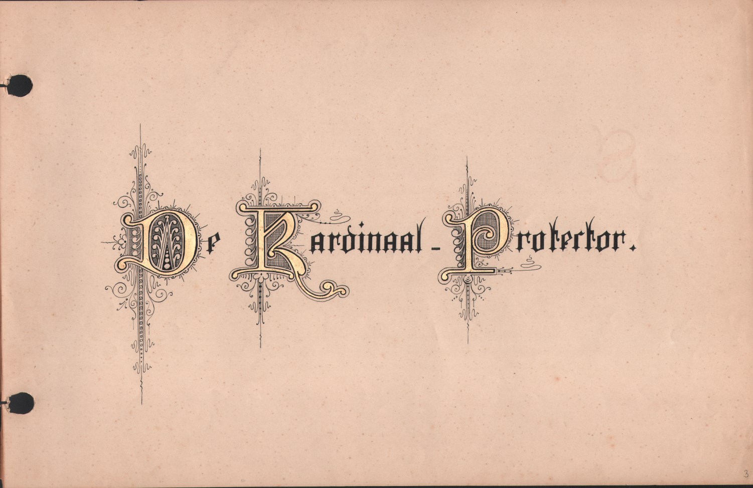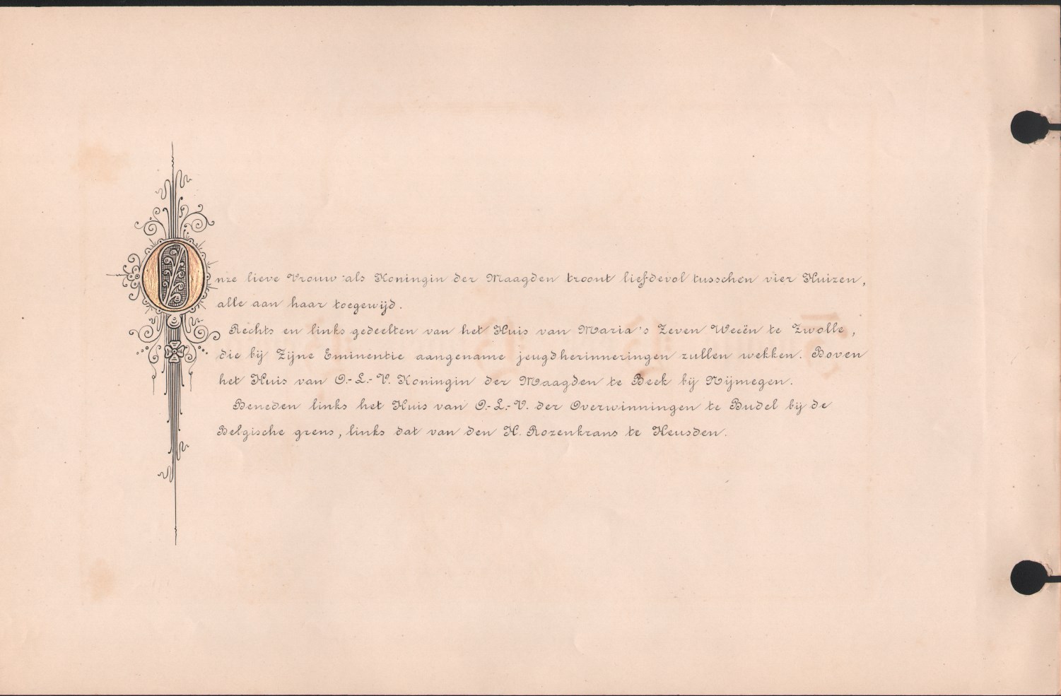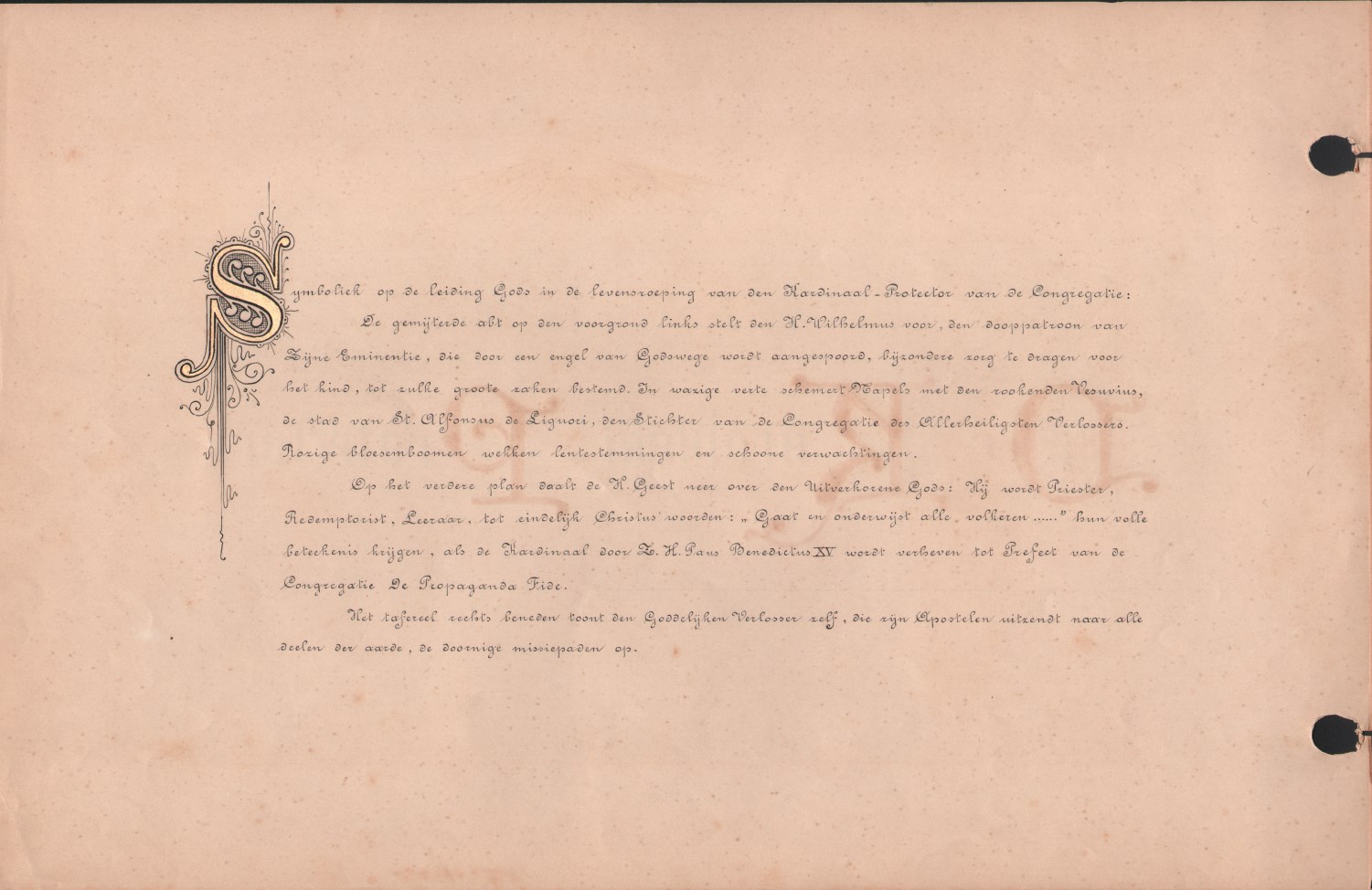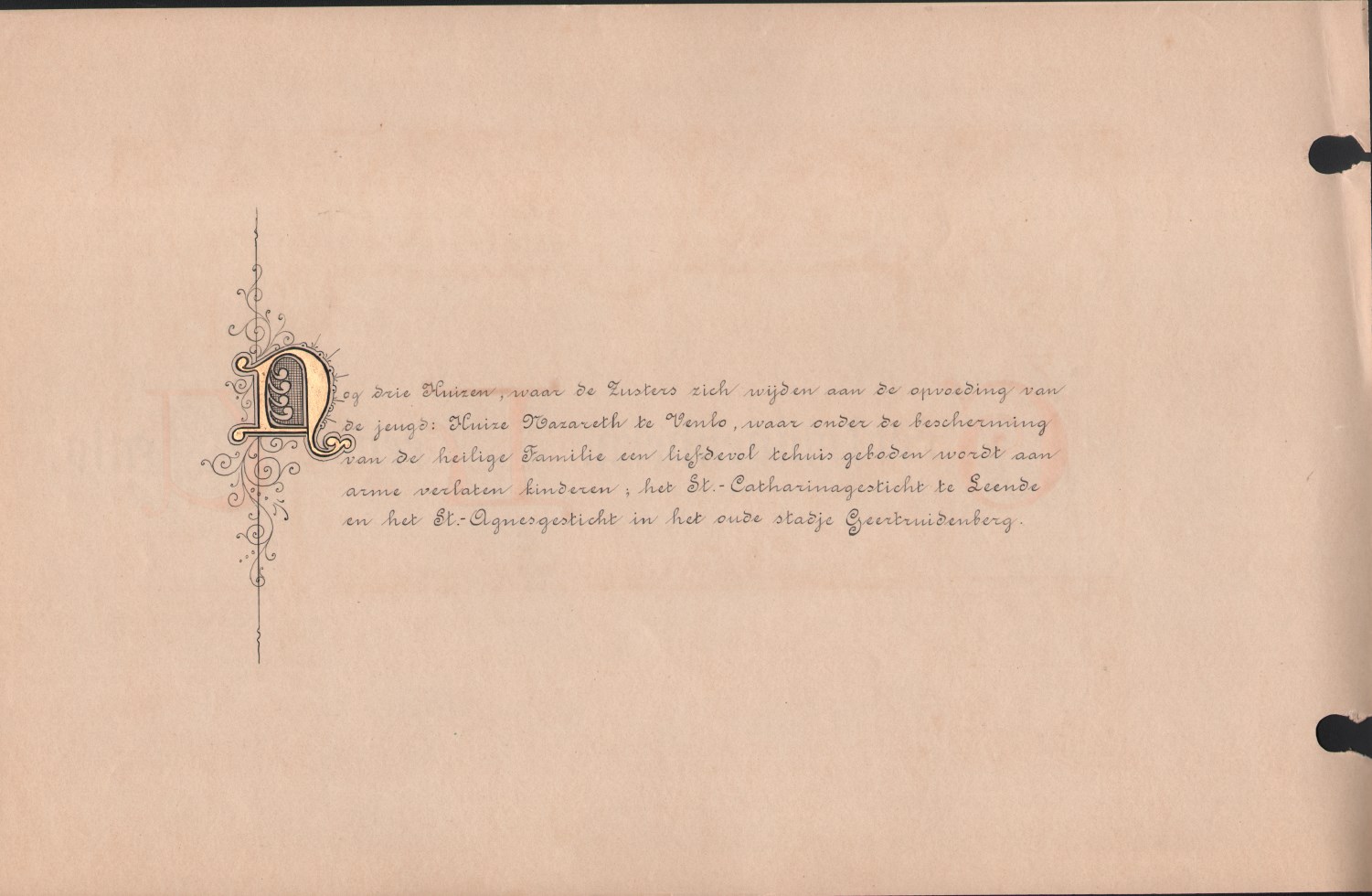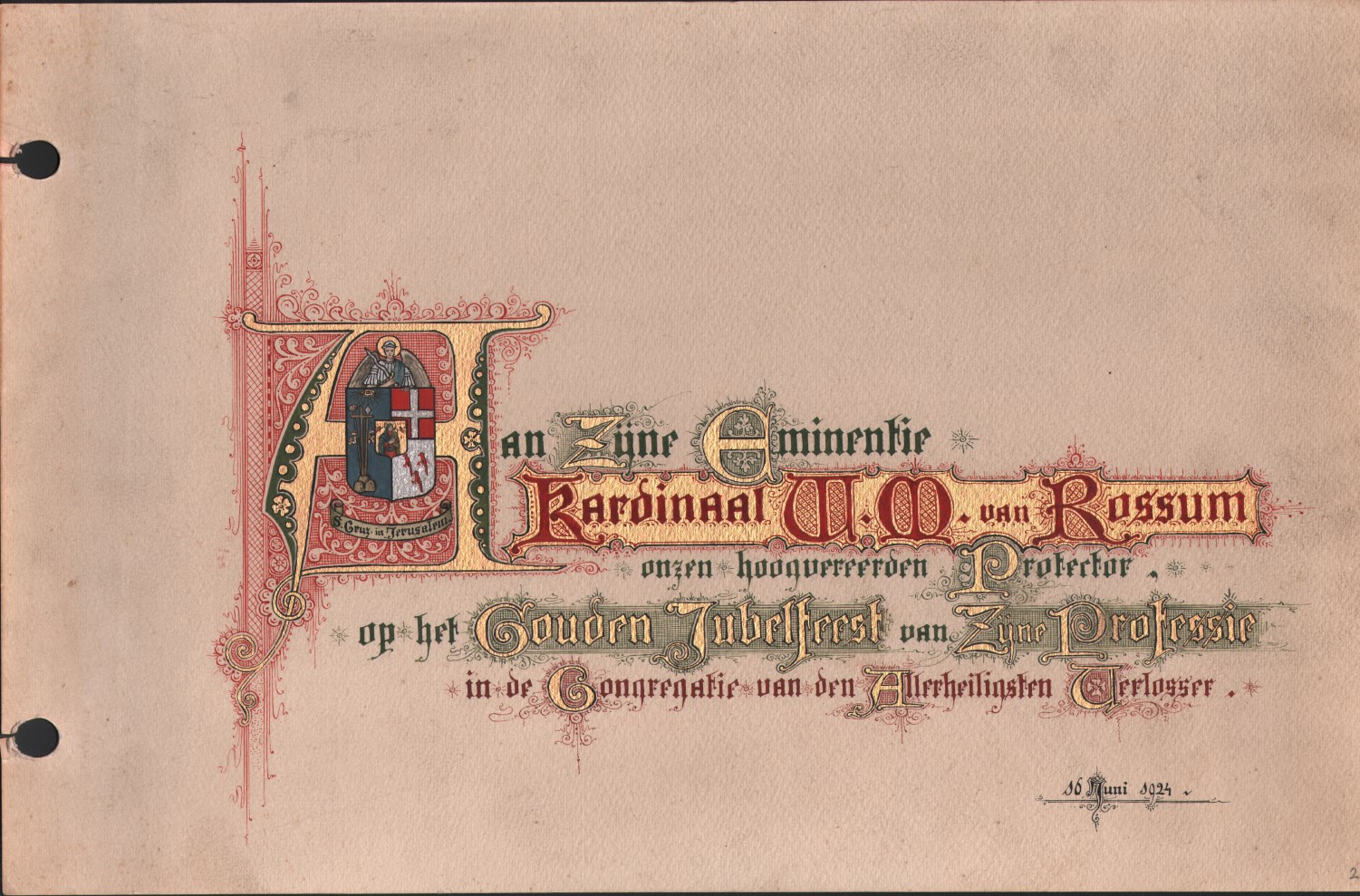 Album met tekeningen stichtingen congregatie van zusters van Liefde aangeboden aan Van Rossum. Band van Indisch weefsel met gouddraad. 1r: blanco 1v: blanco 2r: Blad met rijkversierde letters met de tekst: Aan Zijne Eminentie Kardinaal W.M. van Rossum onzen hoogvereerden Protector op het Gouden Jubelfeest van Zijne Professie in de Congregatie van den Allerheiligsten Verlosser ...